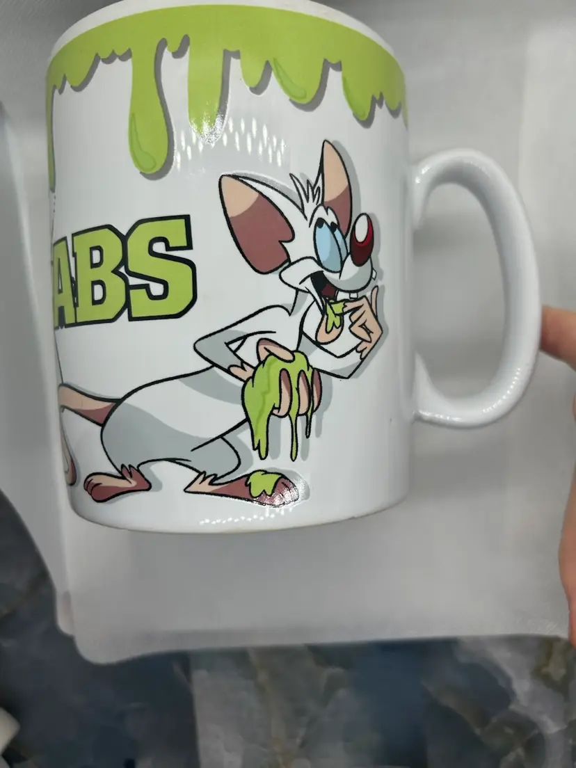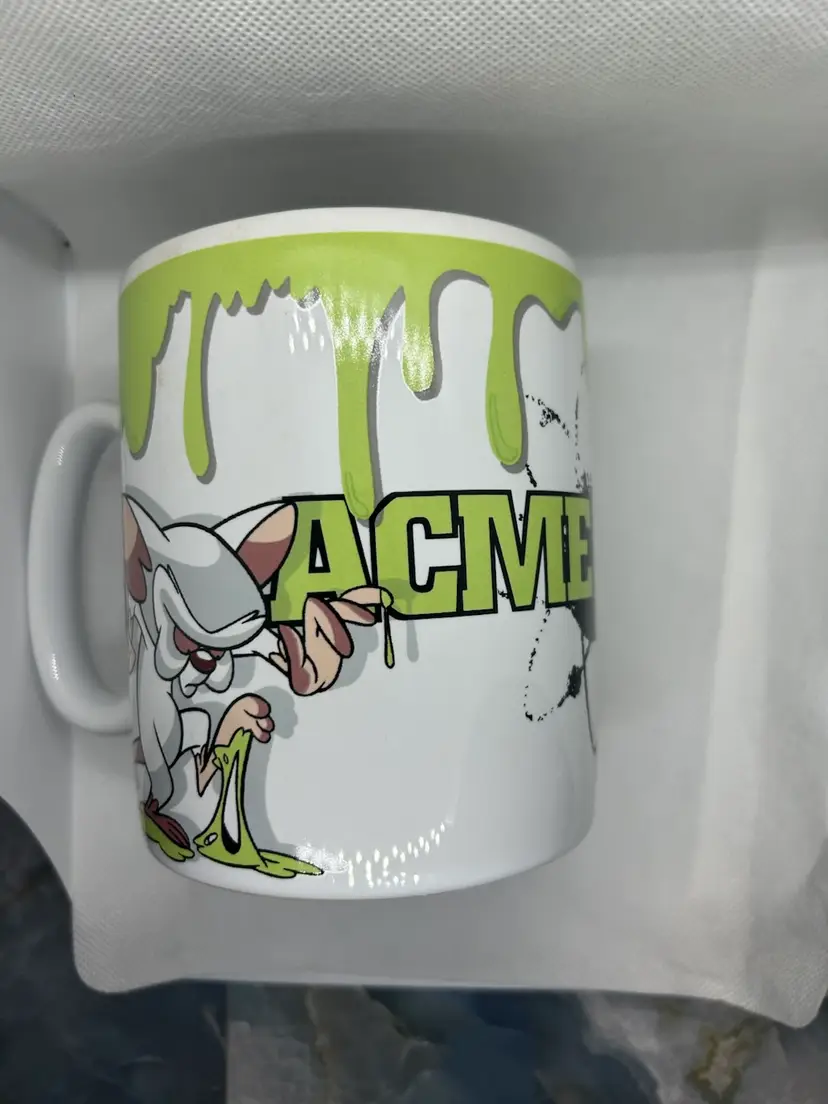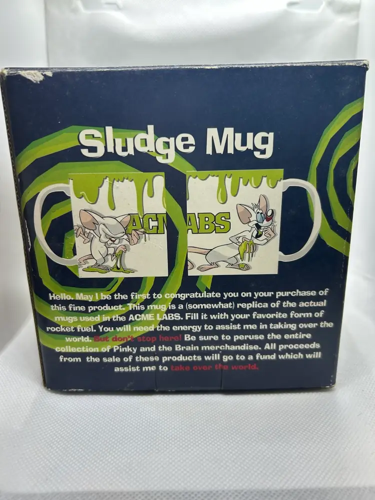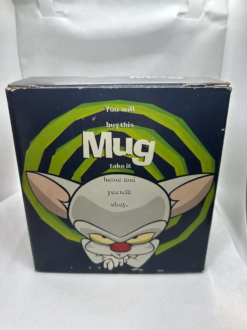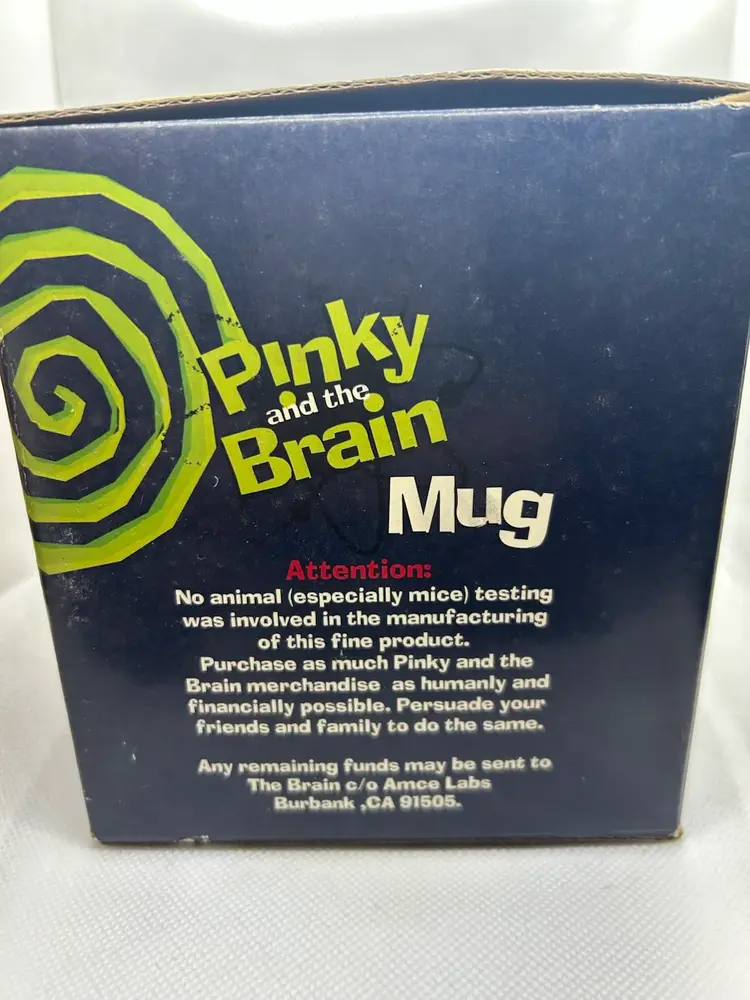 Vintage 1996 Pinky and the Brain Big Coffee Mug. This is a collectible item featuring the characters from the Animaniac TV show. Produced by Warner Bros, this extra large mug holds close to 28 ounces of liquid. In excellent condition, and includes original box which is in fair condition. Please view the pictures.