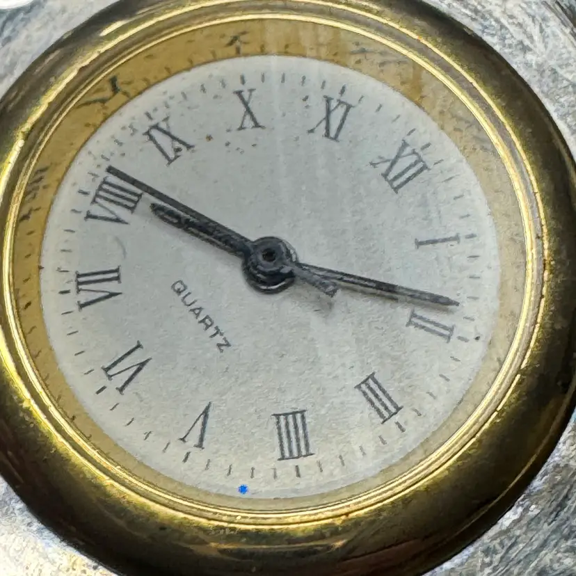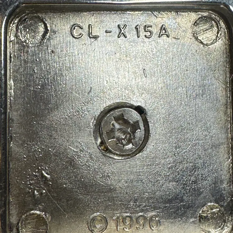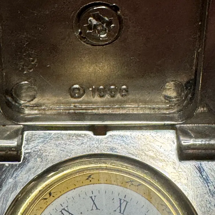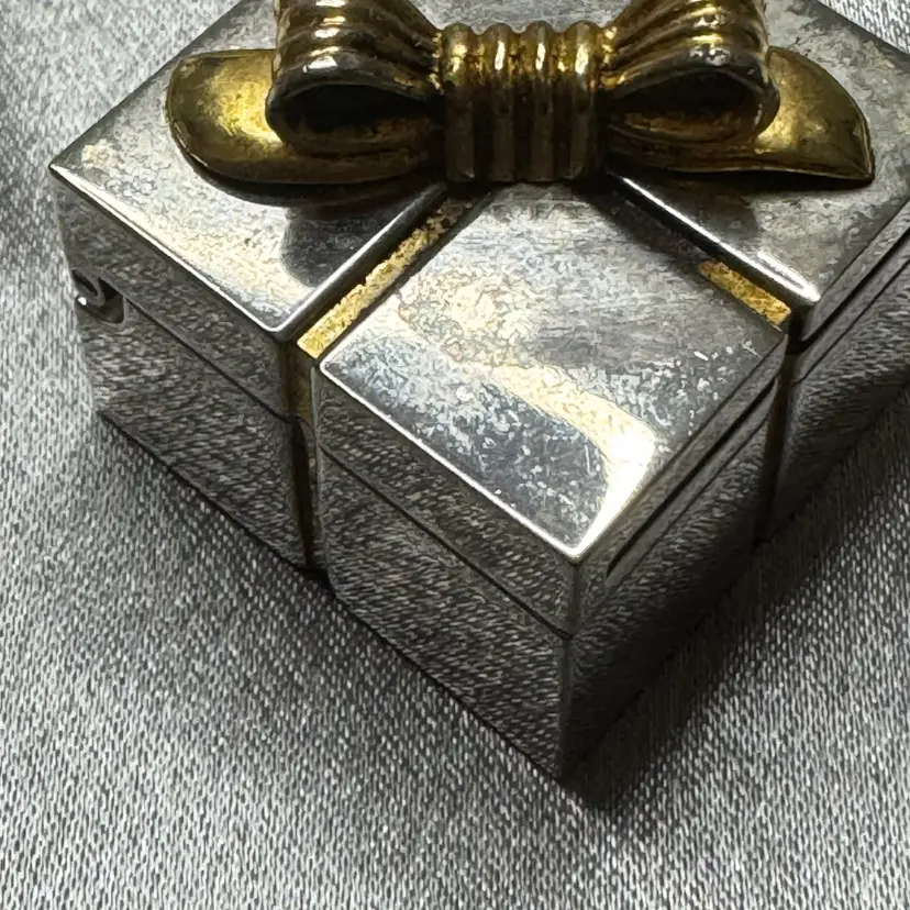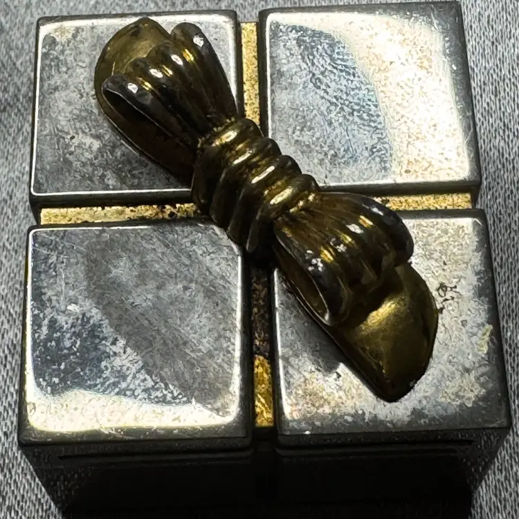 Add a touch of 90s charm to your desk or bedside table with this unique vintage novelty clock. Designed to look like a perfectly wrapped gift, this heavy-weight metal clock features a polished silver-tone finish accented by a decorative gold-tone ribbon and bow. The hinged lid opens to reveal a classic white watch face with elegant Roman numeral markers and "Quartz" movement branding. Product Details: • Year: 1996 (Stamped on interior) • Model: CL-X15A • Movement: Quartz (Battery-powered) • Design: Square gift box with a textured bow clasp. • Dimensions: [Insert Measurements here, e.g., Approx 1.5" x 1.5"] • Style: Traditional / Novelty / Desk Accessory Condition: Good vintage condition with a lovely natural patina. There is some visible surface wear and minor pitting on the metal casing (see photos), which adds to its authentic vintage character. Note: The clock currently needs new battery.