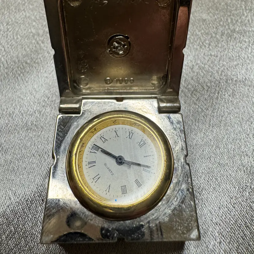1996 SILVER and GOLDTONE GIFT BOX Hinged Travel Desk Clock - Roman Numeral Dial