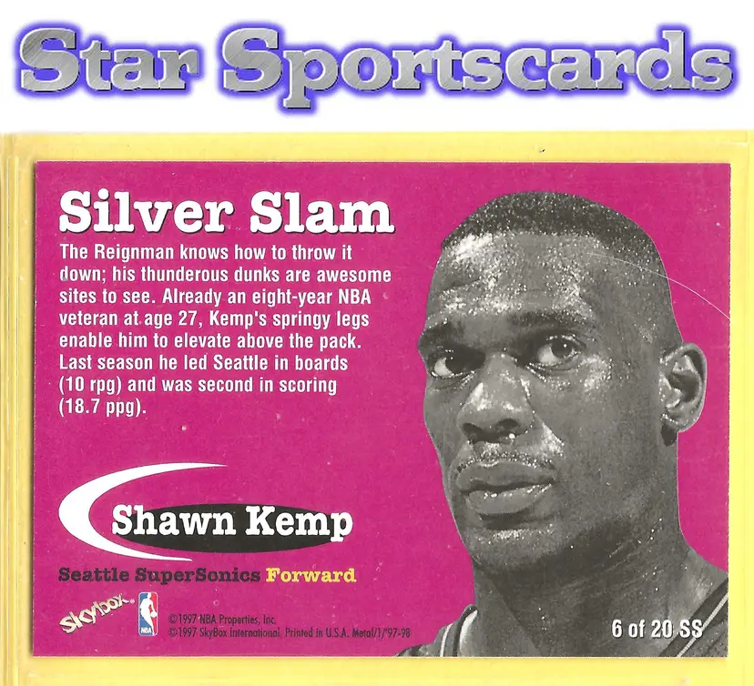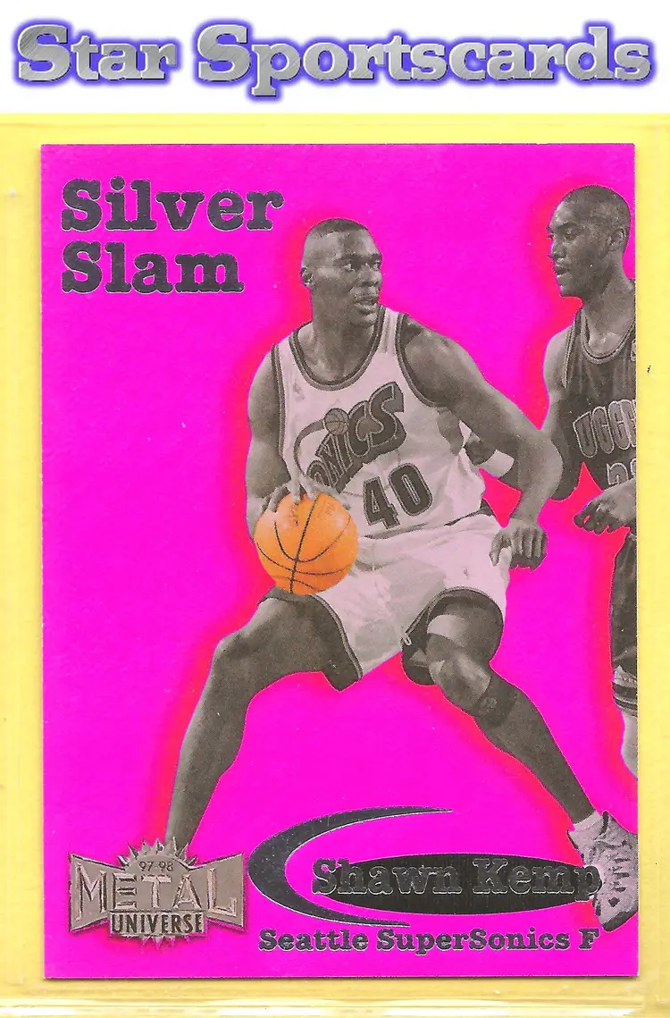 This is a nice example of a 1997-98 Metal Universe #6 SS Shawn Kemp Silver Slam .Other important information about this card: In Shawn Kemp played for the Seattle SuperSonics.Please check out our other listings for more great cards.