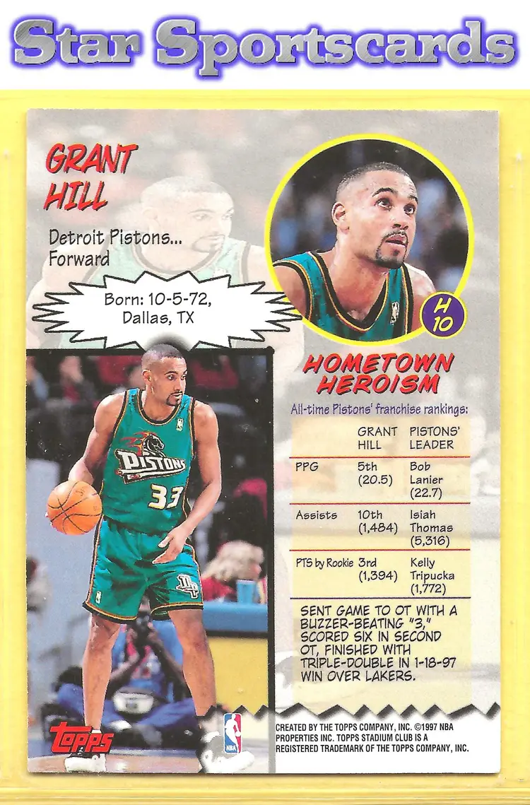 This is a nice example of a 1997-98 Stadium Club #H10 Grant Hill Hardcourt Heroics .Other important information about this card: In Grant Hill played for the Detroit Pistons.Please check out our other listings for more great cards.