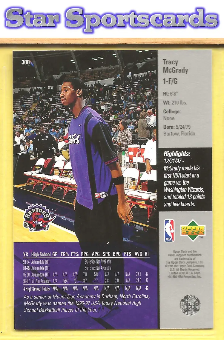 This is a nice example of a 1997-98 Upper Deck #300 Tracy McGrady .Other important information about this card: RC Rookie In Tracy McGrady played for the Toronto Raptors.Please check out our other listings for more great cards.