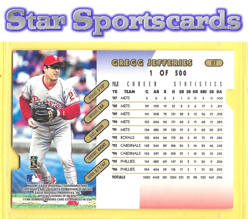 This is a nice example of a 1997 Donruss #87 Gregg Jefferies Press Proofs Gold EX Condition (corner & edge issues) .Other important information about this card: In Gregg Jefferies played for the Philadelphia Phillies.Please check out our other listings for more great cards.