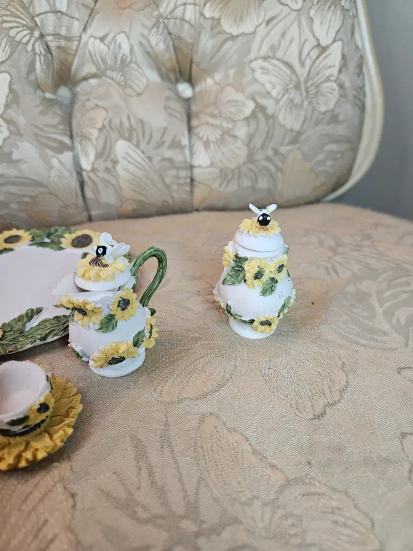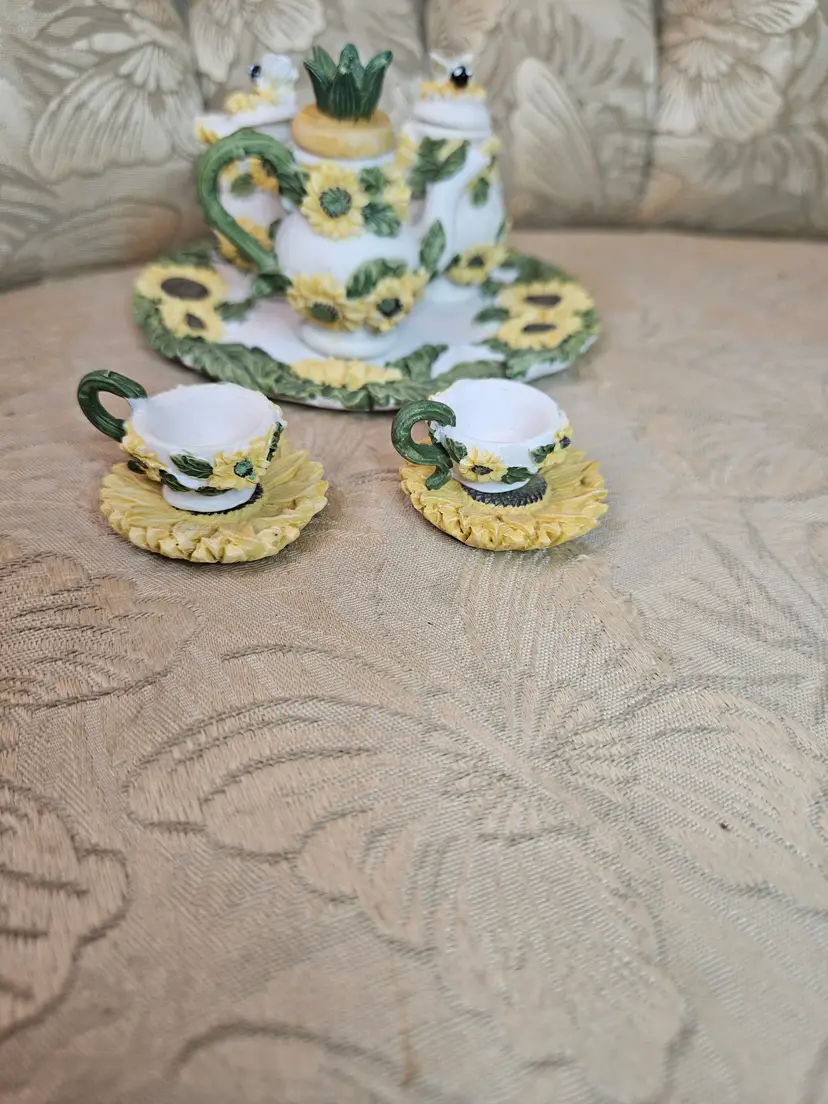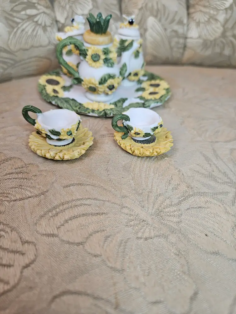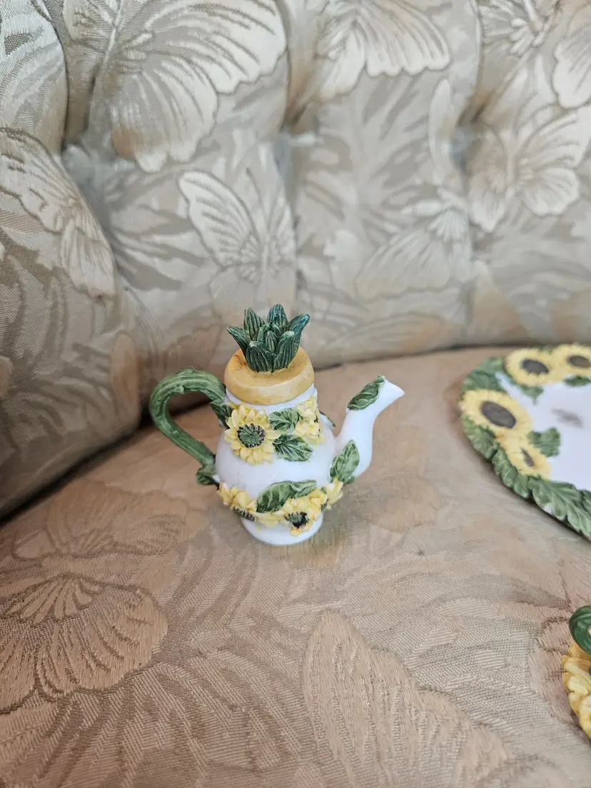 The 1997 Popular Imports Resin Mini Tea Set Sunflowers is an 11-piece tea set featuring a charming sunflower pattern on colorful resin pieces. This small set includes 11 different pieces making it perfect for all occasions. Standing at a vintage time period manufactured between 1990-1999, this original set by Popular Imports is a collectible piece for tea enthusiasts looking for a unique addition to their collection.