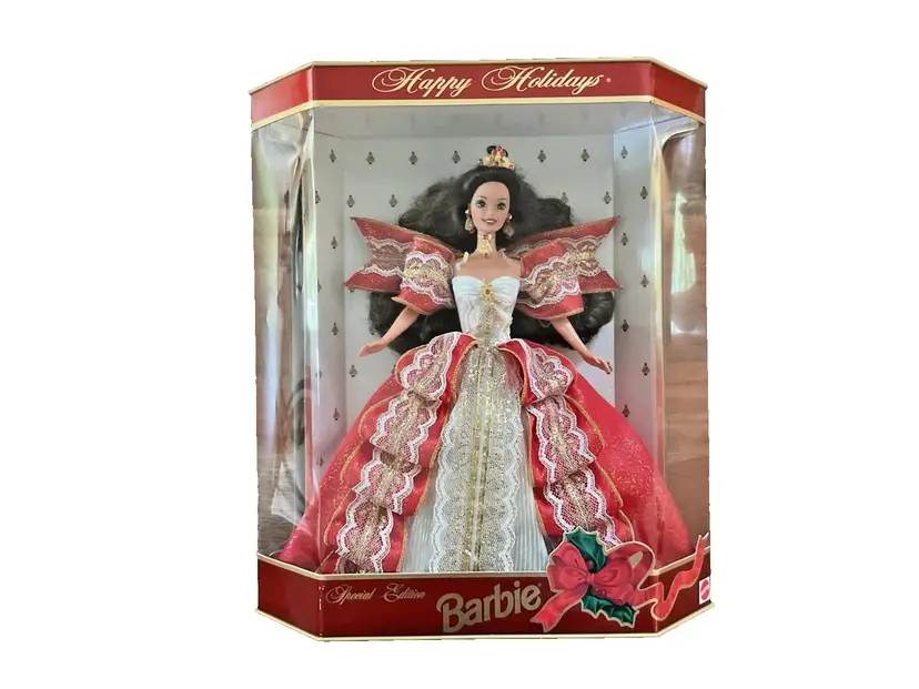 The 1997 Special Edition "10th Anniversary" Happy Holidays/Green Eyes Barbie is a vintage collectible doll by Mattel. This Barbie doll has brown wavy hair, green eyes, and a light complexion, featuring a Christmas theme as part of the Happy Holidays Barbie product line. The special edition Barbie comes in its original unopened packaging from 1997, making it a sought-after item for collectors of Barbie dolls and fashion dolls. This Barbie is a single unit and part of the Barbie franchise, representing a timeless piece of fashion and beauty from the 1990s.