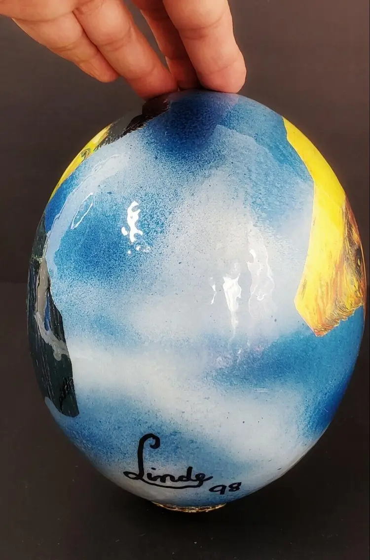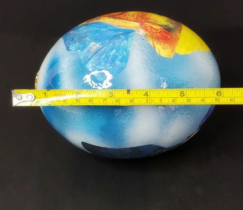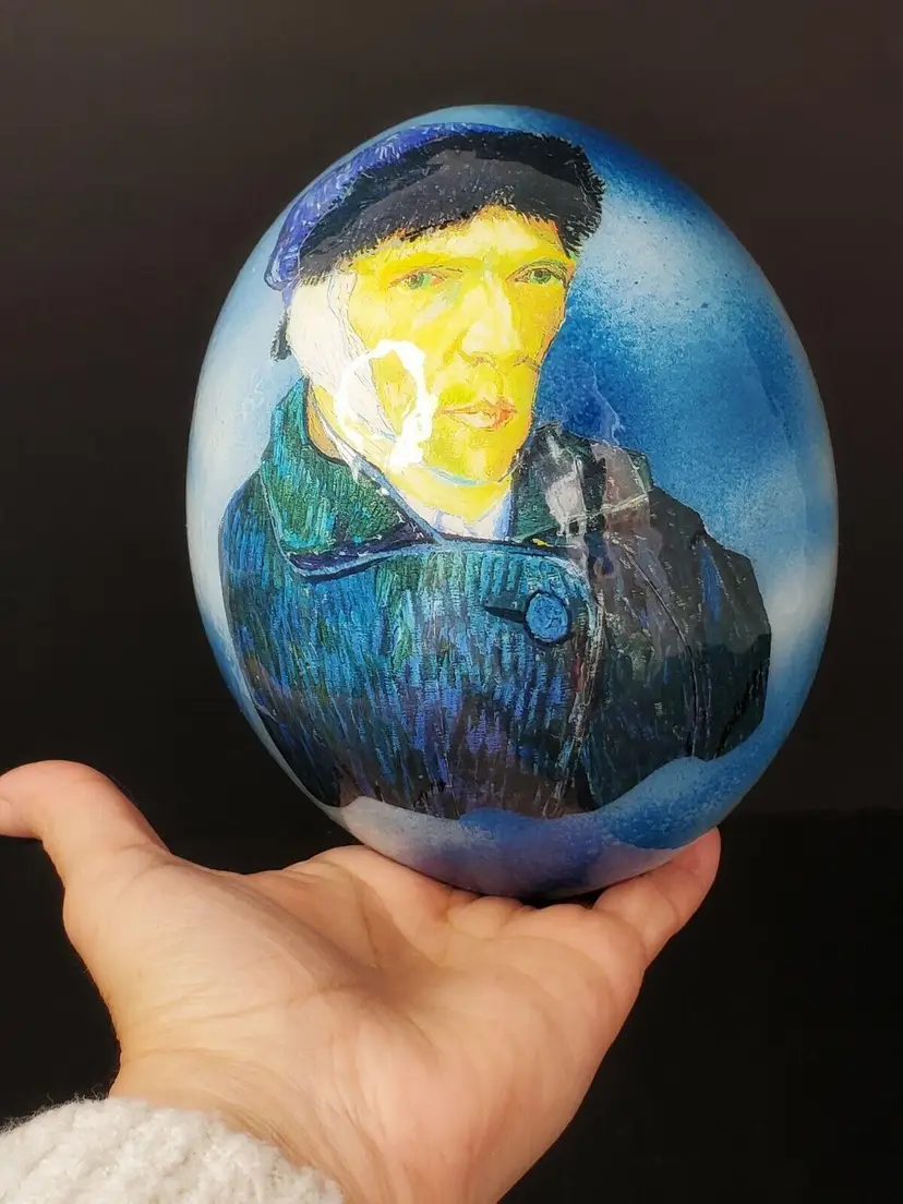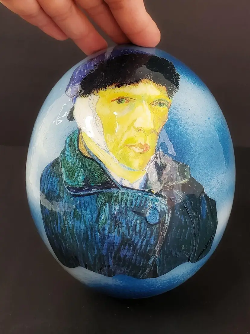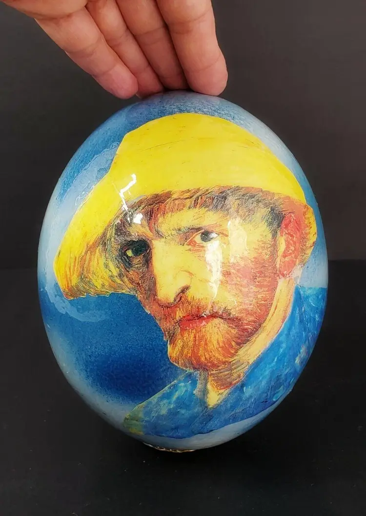 Unique, one of a kind mixed media - Art Glass Egg Decor - Handblown, signed, extra large. It seems to be paper applied on the inside + some reverse painting of Vincent Van Gogh portrait. Condition: excellent, no chips or cracks. There is no hook for hanging. Measurement: 7.5" x 6".