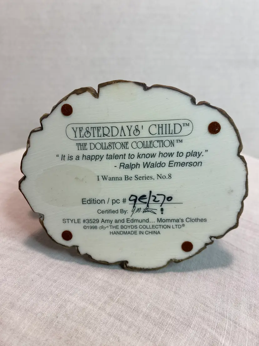“Momma’s Clothes” figurine, I Wanna be Series #8, Style#3529, numbered 9E/270. No chips or cracks, coloring is good. No box or certificate available. Measurements are 5 1/2” tall x 5” long x 3 1/2” wide.