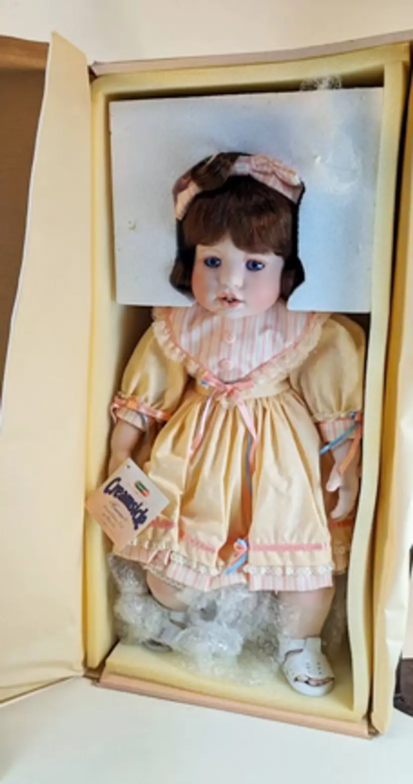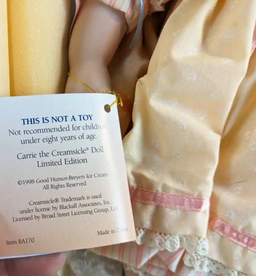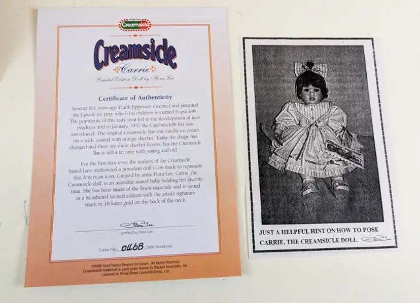 1998 Creamsicle 75th anniversary limited edition Carrie doll, Number 468 out of 2000. Designed by Flora Lee, 19 inches