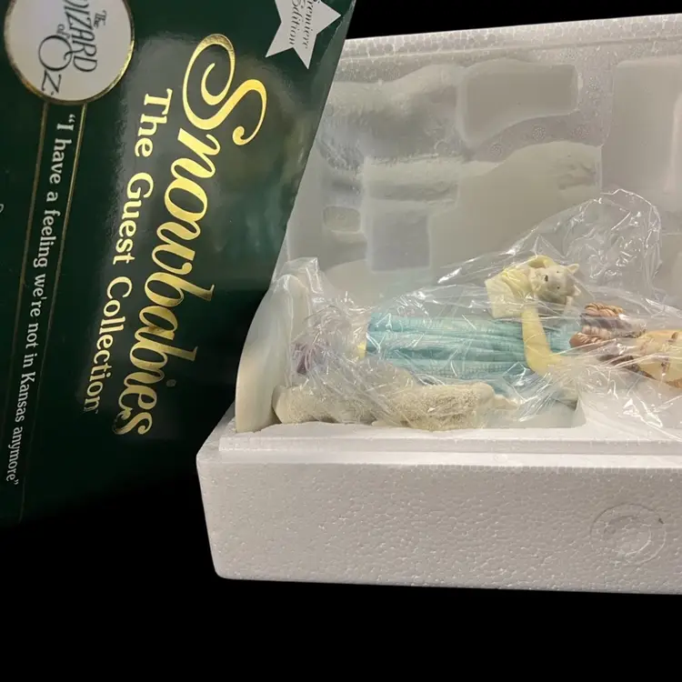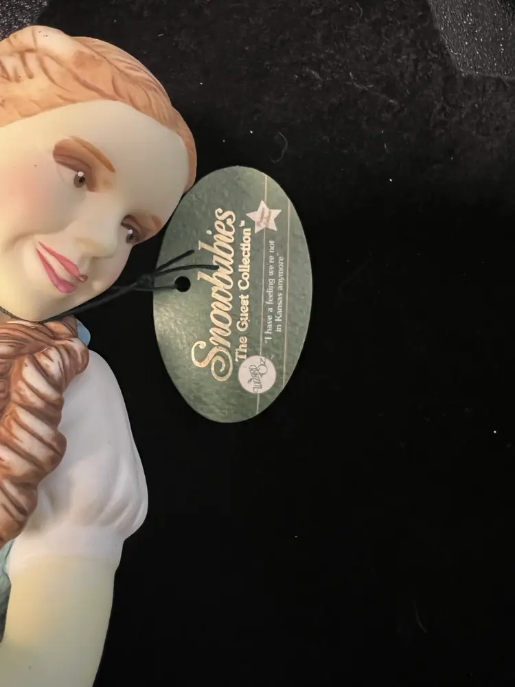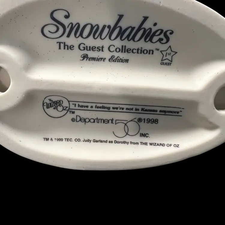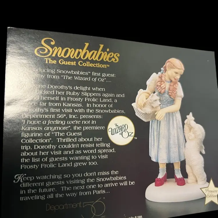 This particular figurine represents Dorothy Gale from the classic film "The Wizard of Oz," a significant cultural icon. Introduced as the "first guest" in the collection, it marks the beginning of a series that likely aimed to blend the magic of Oz with the gentle charm of Snowbabies. The inclusion of Toto and a companion Snowbaby adds to the narrative and appeal of the piece, making it a desirable item for fans of both franchises.