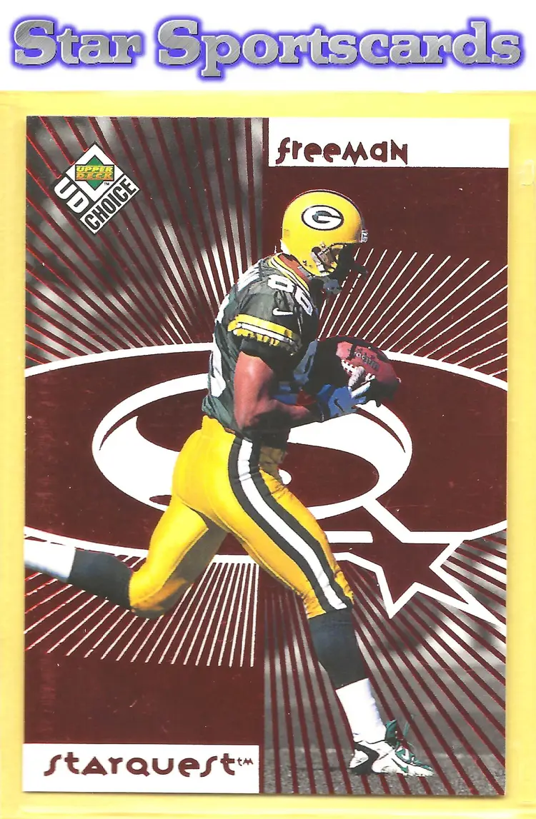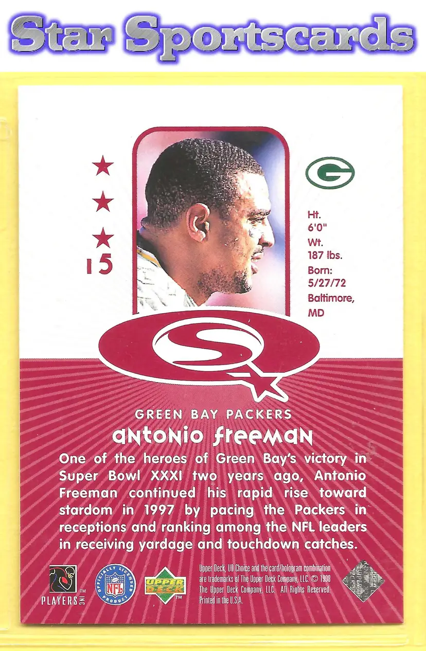 This is a nice example of a 1998 UD Choice #15 Antonio Freeman StarQuest Red .Other important information about this card: In Antonio Freeman played for the Green Bay Packers.Please check out our other listings for more great cards.