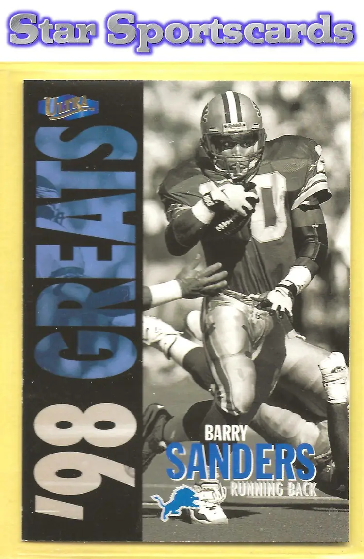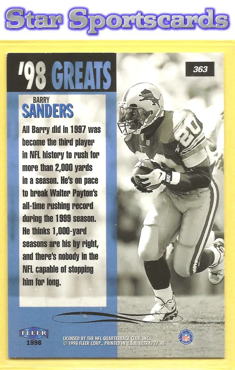 This is a nice example of a 1998 Ultra #363 Barry Sanders .Other important information about this card: In Barry Sanders played for the Detroit Lions.Please check out our other listings for more great cards.