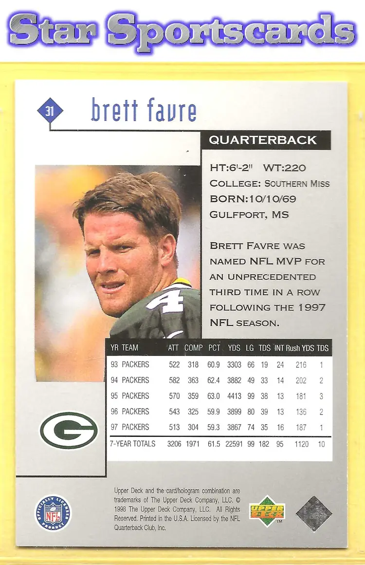 This is a nice example of a 1998 Upper Deck Black Diamond Rookie Edition #31 Brett Favre .Other important information about this card: In Brett Favre played for the Green Bay Packers.Please check out our other listings for more great cards.