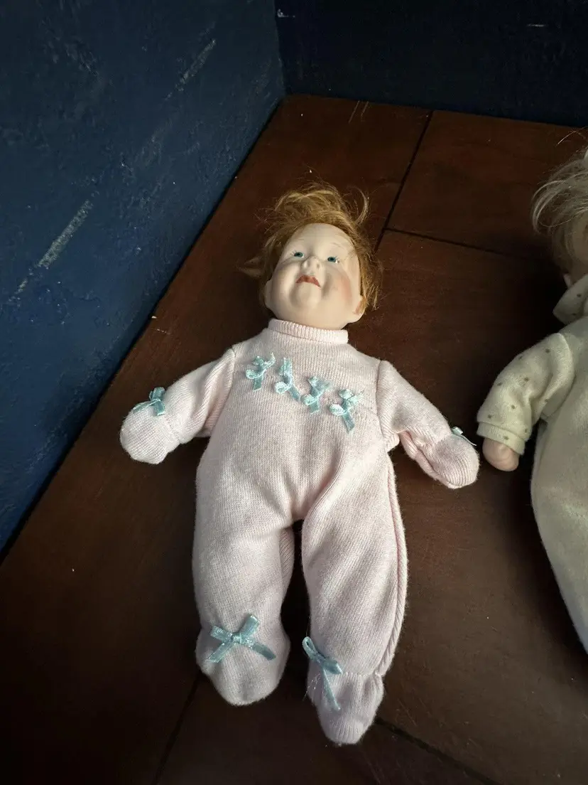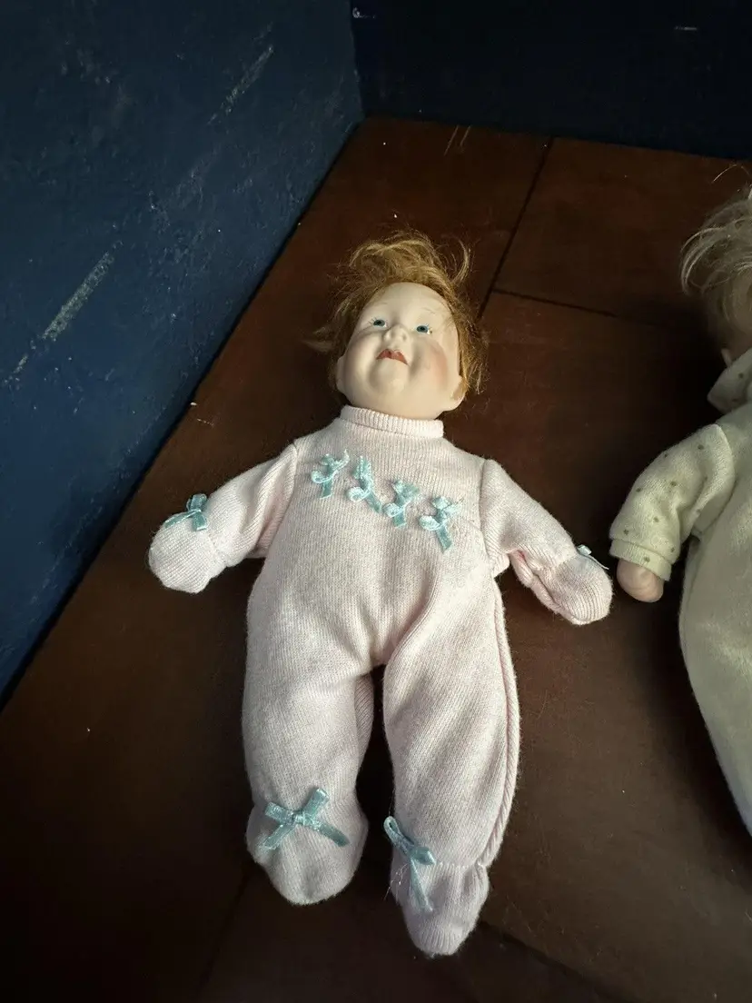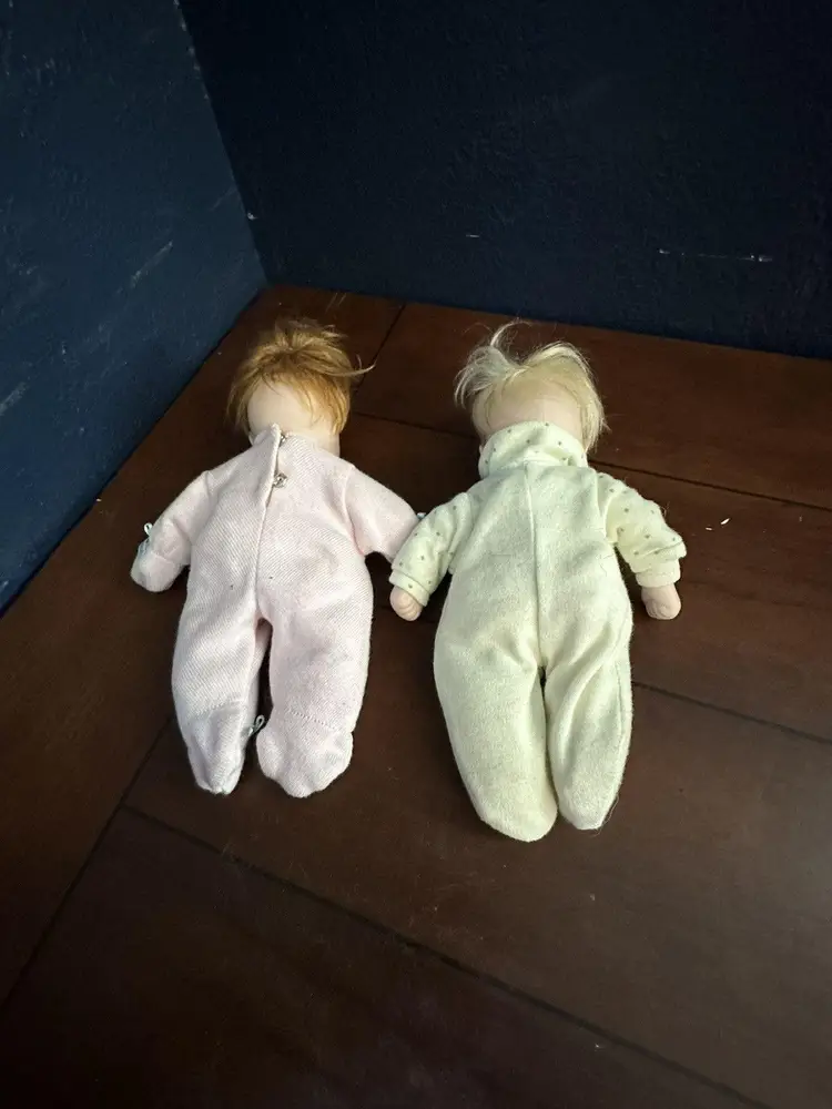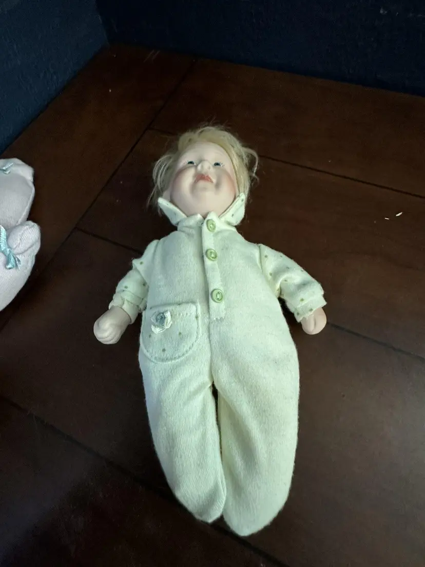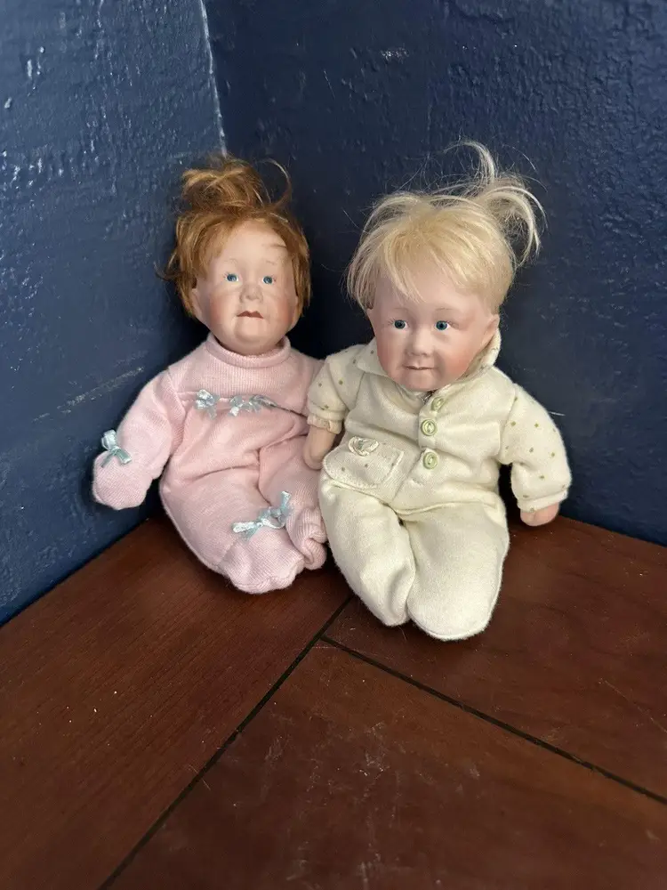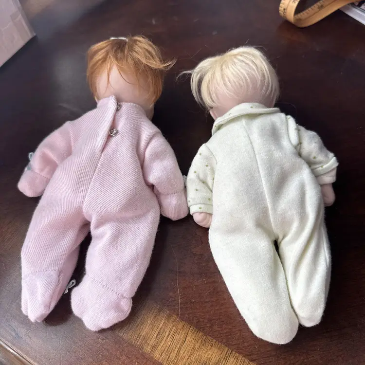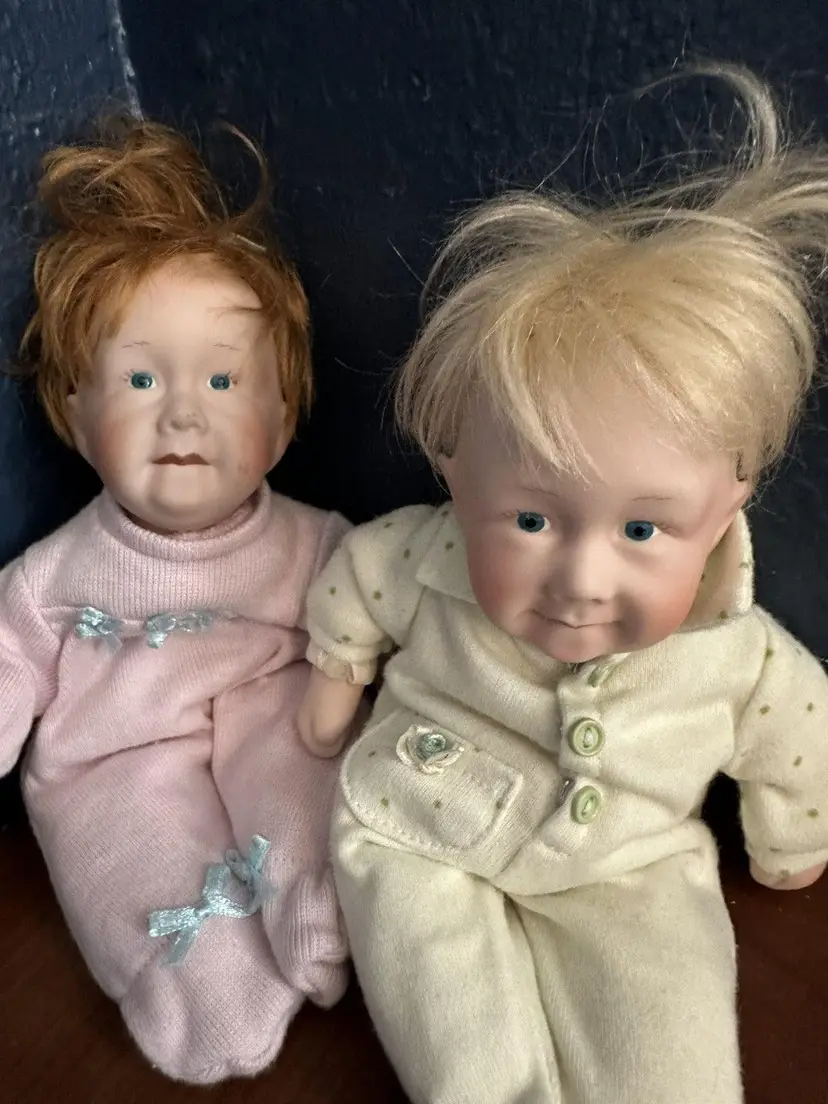 Embrace the charm of yesteryear with this delightful set of 2 Pat Secrist baby dolls, each standing at a cozy 8 inches tall. Crafted in 1998, these dolls feature porcelain heads atop beanbag plush bodies, recreating the classic softness of vintage dolls. Their fair complexion and striking blue eyes reflect a timeless aesthetic that's perfect for collectors or imaginative play. Designed for all occasions, the dolls come as a lot, making them an instant addition to any collection. They boast the craftsmanship of the renowned brand PAT SECRIST and are a testament to the beauty and durability of well-made toys. Whether for display or interactive storytelling, these dolls are sure to enchant. The girl has pink outfit with ribbon in her red hair, the boy has yelloe with blond hair.Set of 2 Pat Secrist 8 inch dolls Porcelain Head Soft Body Girl and Boy