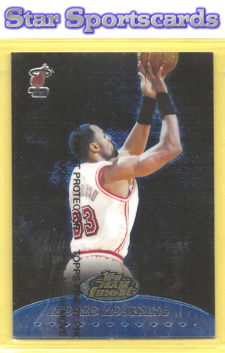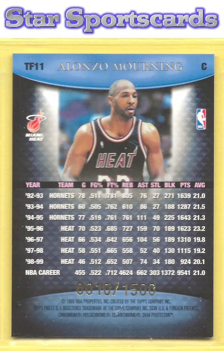 This is a nice example of a 1999-00 Finest #TF11 Alonzo Mourning Team Finest Blue #/1500 .Other important information about this card: SN In Alonzo Mourning played for the Miami Heat.Please check out our other listings for more great cards.