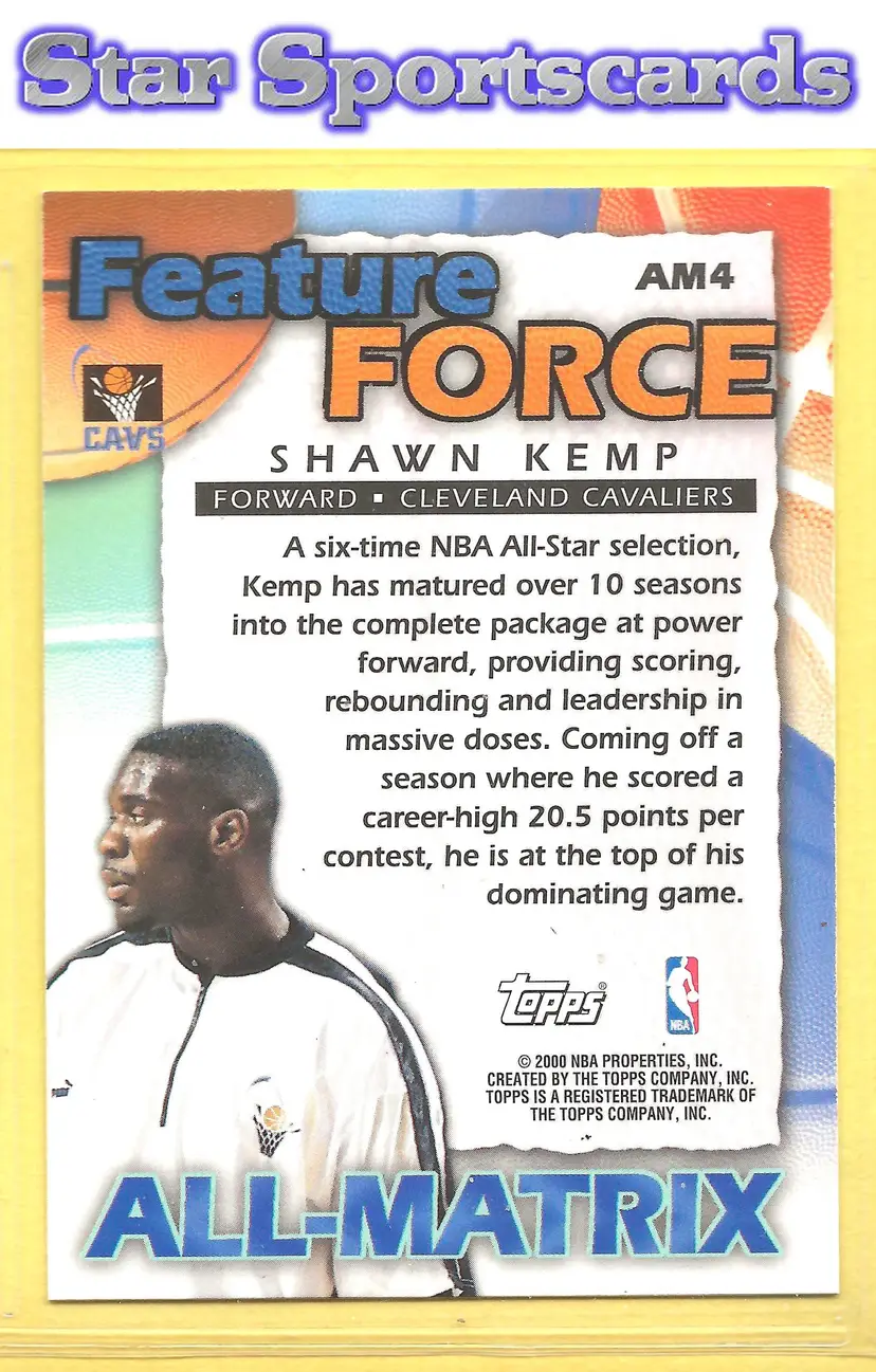 This is a nice example of a 1999-00 Topps #AM4 Shawn Kemp All-Matrix .Other important information about this card: In Shawn Kemp played for the Cleveland Cavaliers.Please check out our other listings for more great cards.