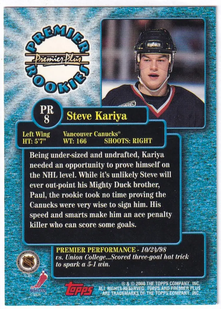 1999-00 Topps Premier Plus Premier Rookies #PR8 Steve Kariya Vancouver Canucks