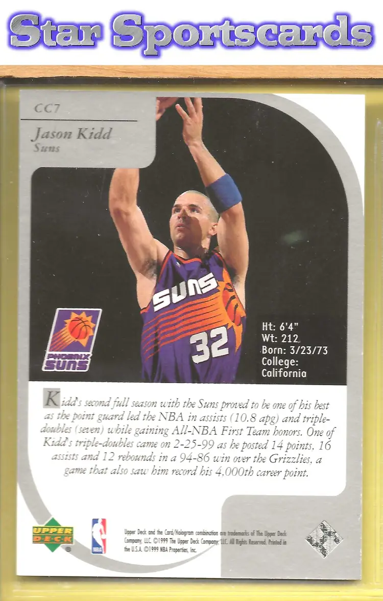 This is a nice example of a 1999-00 Upper Deck Ovation #CC7 Jason Kidd Curtain Calls .Other important information about this card: In Jason Kidd played for the Phoenix Suns.Please check out our other listings for more great cards.