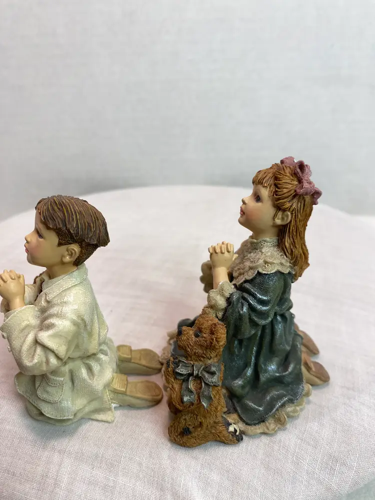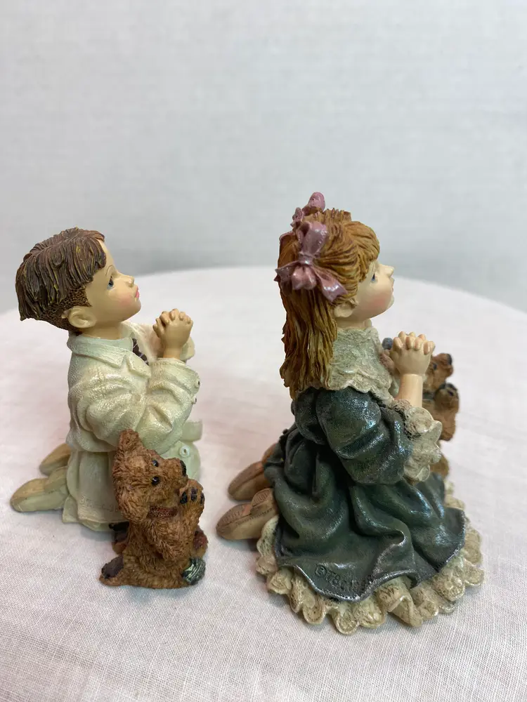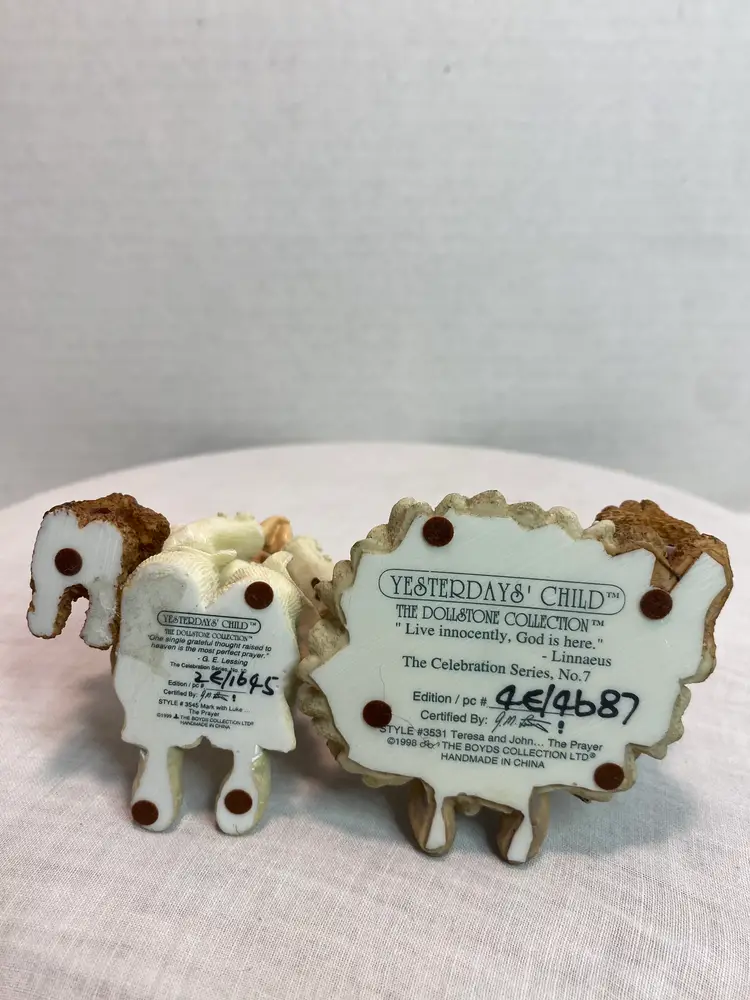 Sold as set 1999 Mark with Luke “The prayer” figurine, style# 3545, numbered 2E/1645, The Celebration Series #10, measurements are 3” tall x 2 3/8” long x 2 3/8” wide. 1998 Teresa and John “The Prayer” figurine, Style# 3531, numbered 4E/4687, The celebration series#7. Measurements 3 /2” tall x 3” long x 2 3/4” wide. Neither has chips or cracks, coloring on both is good. No boxes or certificates, display pieces only.