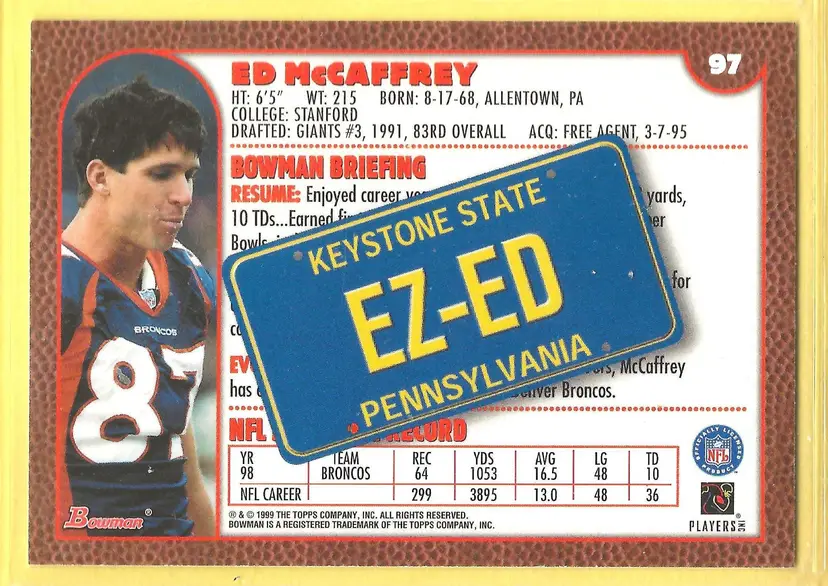 This is a nice example of a 1999 Bowman #97 Ed McCaffrey Interstate .Other important information about this card: In Ed McCaffrey played for the Denver Broncos.Please check out our other listings for more great cards.