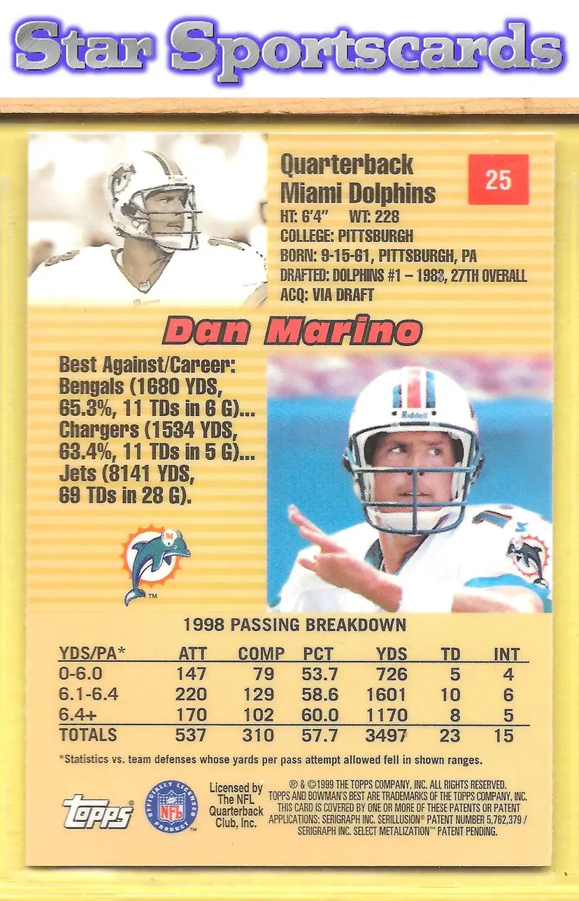 This is a nice example of a 1999 Bowman's Best #25 Dan Marino .Other important information about this card: In Dan Marino played for the Miami Dolphins.Please check out our other listings for more great cards.