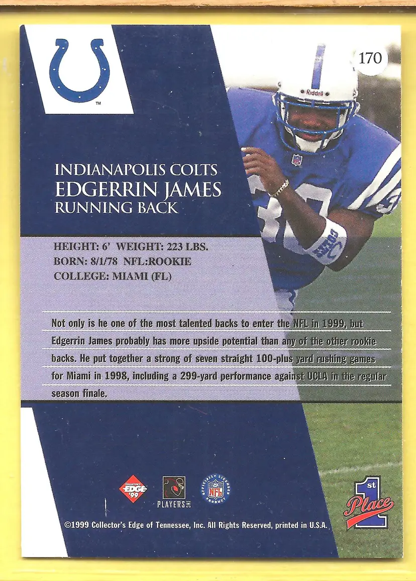 This is a nice example of a 1999 Collector's Edge First Place #170 Edgerrin James .Other important information about this card: RC Rookie In Edgerrin James played for the Indianapolis Colts.Please check out our other listings for more great cards.