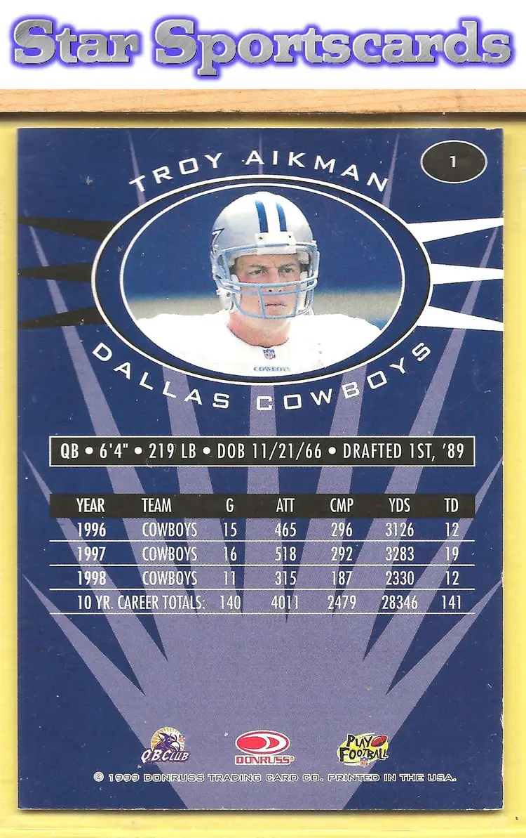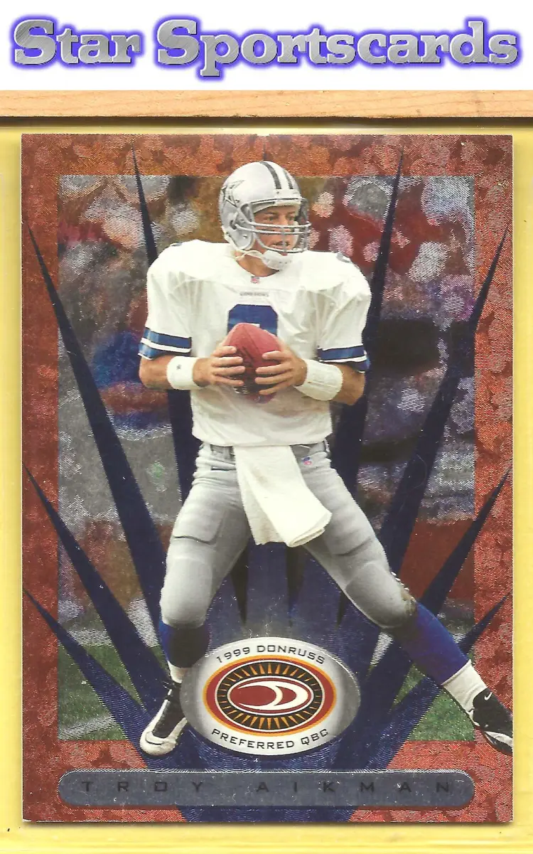 This is a nice example of a 1999 Donruss Preferred QBC #1 Troy Aikman .Other important information about this card: In Troy Aikman played for the Dallas Cowboys.Please check out our other listings for more great cards.