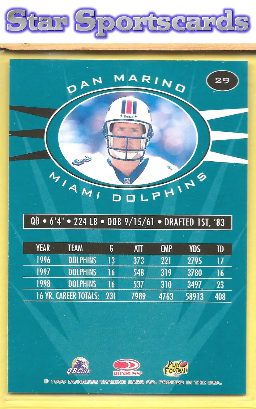 This is a nice example of a 1999 Donruss Preferred QBC #29 Dan Marino .Other important information about this card: In Dan Marino played for the Miami Dolphins.Please check out our other listings for more great cards.