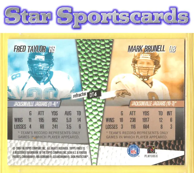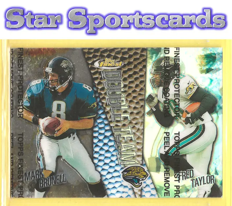 This is a nice example of a 1999 Finest #DT4 Mark Brunell / Fred Taylor Double Team Right Side Refractors .Other important information about this card: In Mark Brunell / Fred Taylor played for the Jacksonville Jaguars.Please check out our other listings for more great cards.