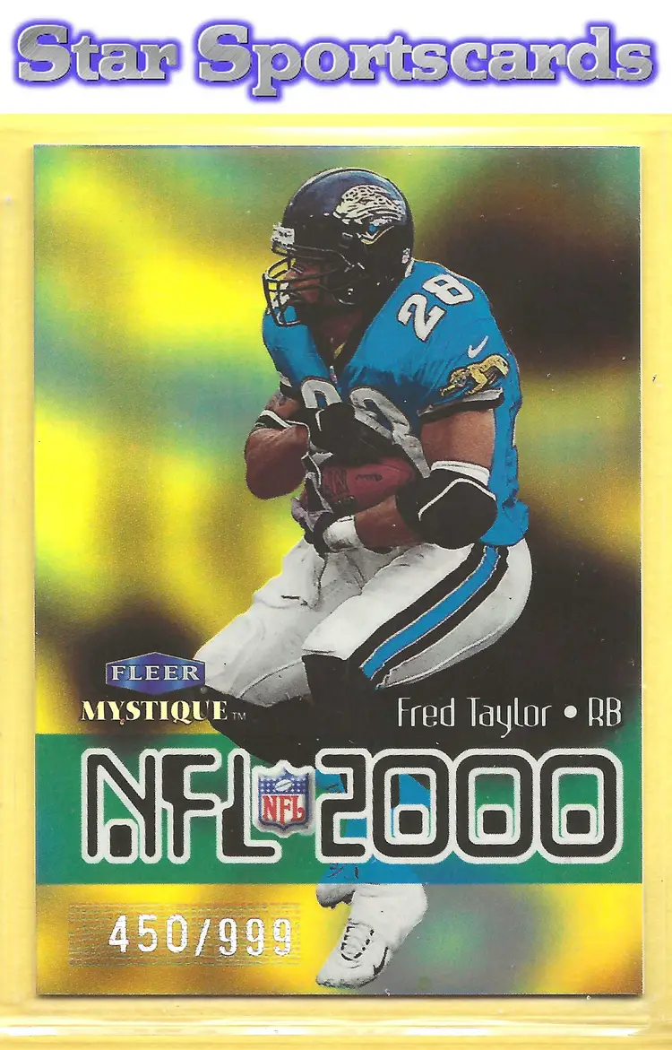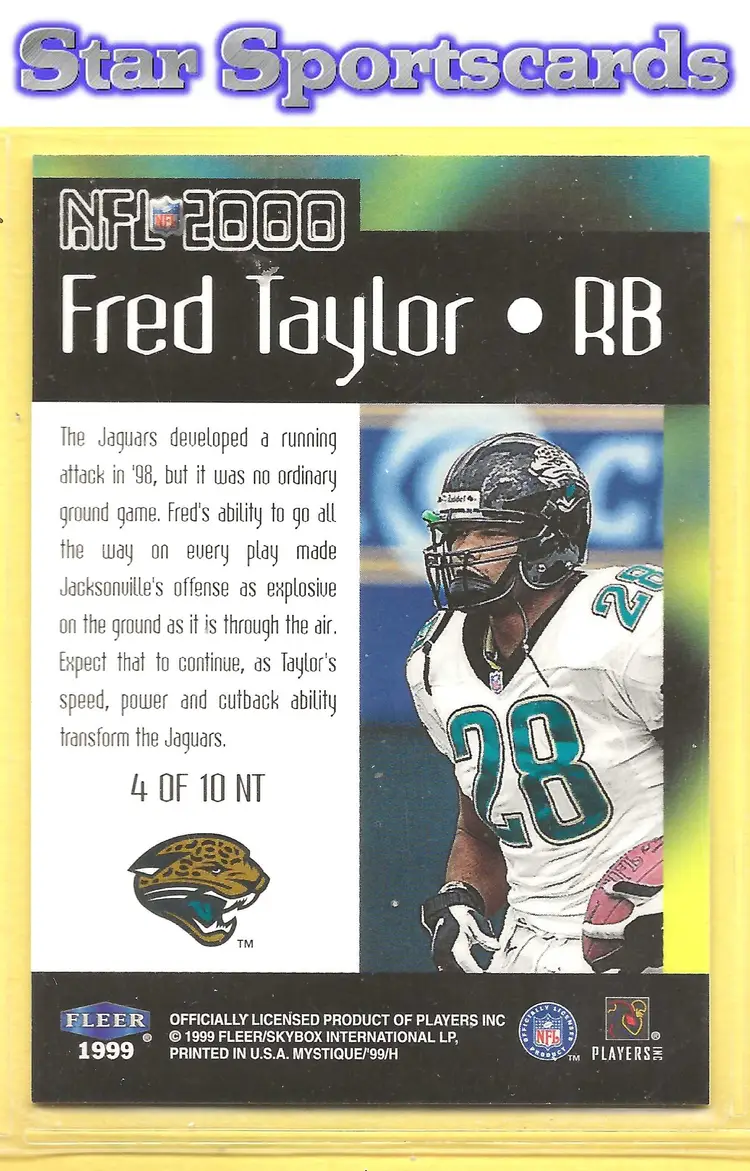 This is a nice example of a 1999 Fleer Mystique #4 NT Fred Taylor NFL 2000 #/999 .Other important information about this card: SN In Fred Taylor played for the Jacksonville Jaguars.Please check out our other listings for more great cards.