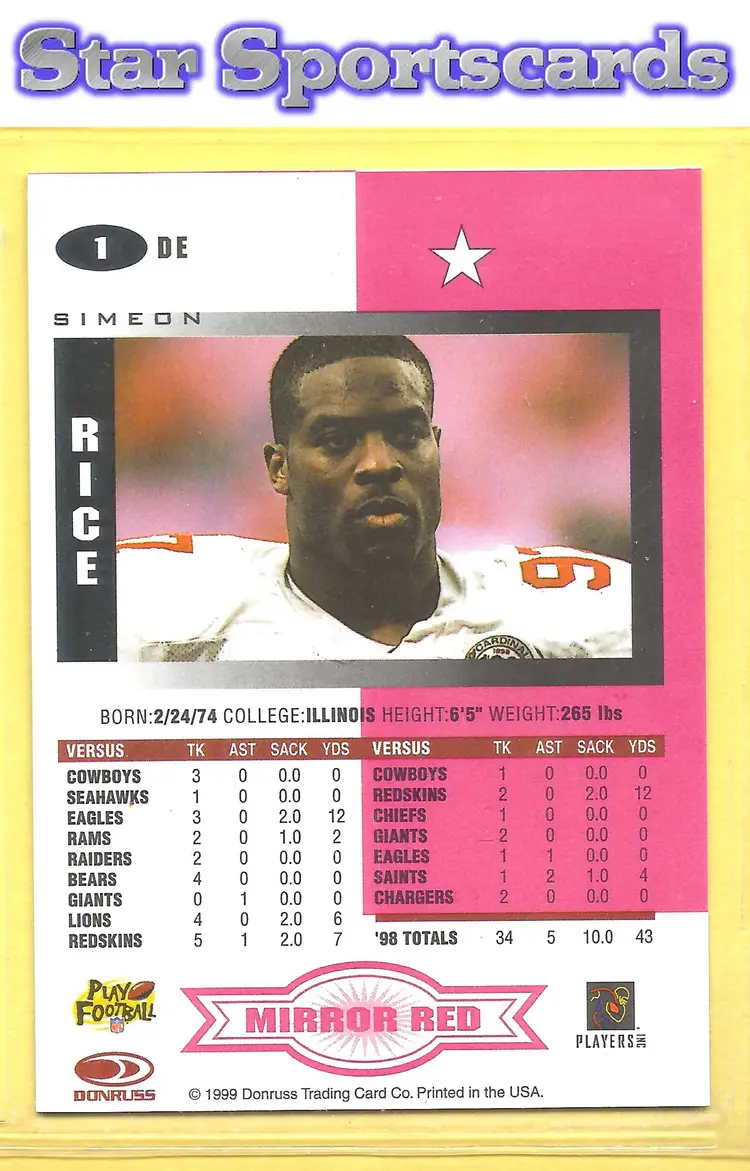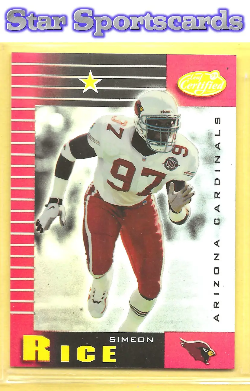 This is a nice example of a 1999 Leaf Certified #1 Simeon Rice Mirror Red .Other important information about this card: In Simeon Rice played for the Arizona Cardinals.Please check out our other listings for more great cards.