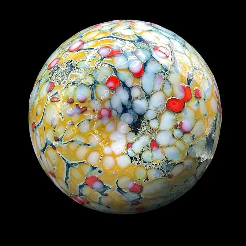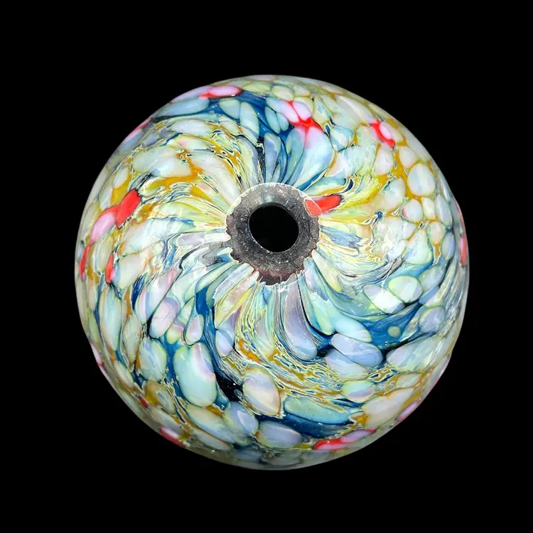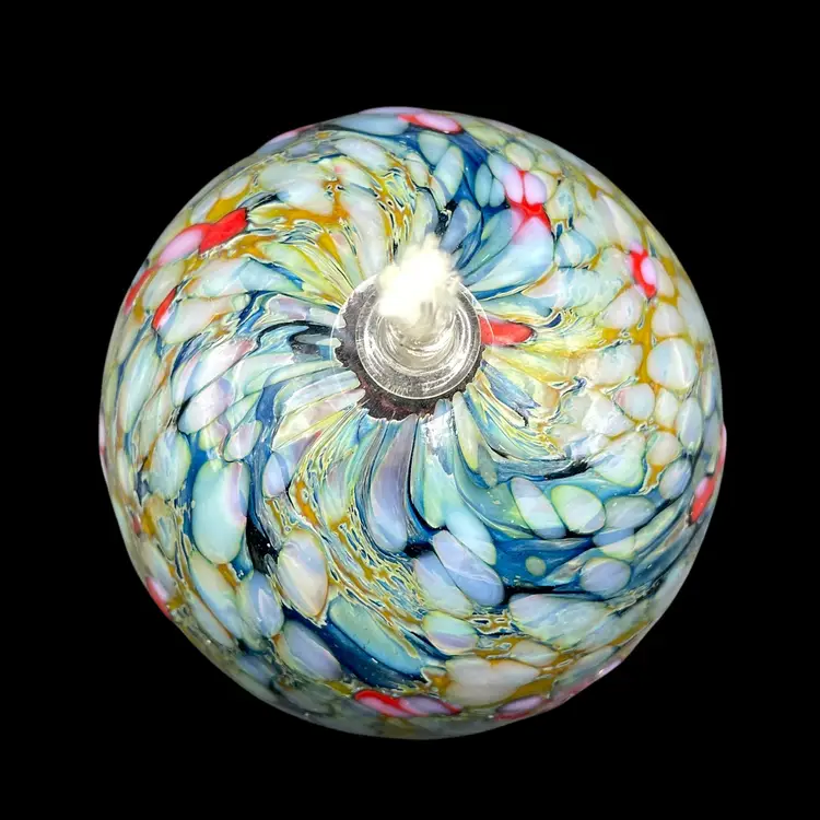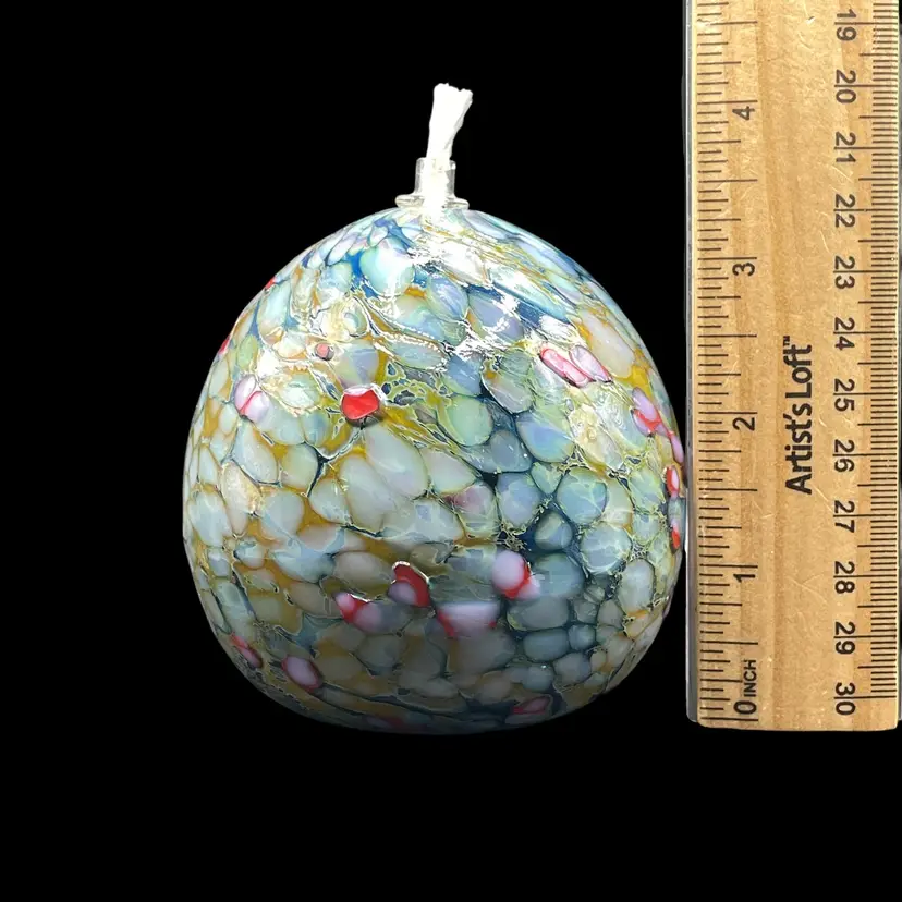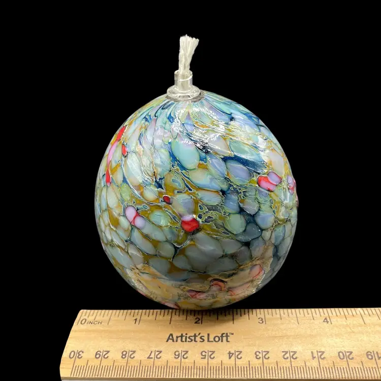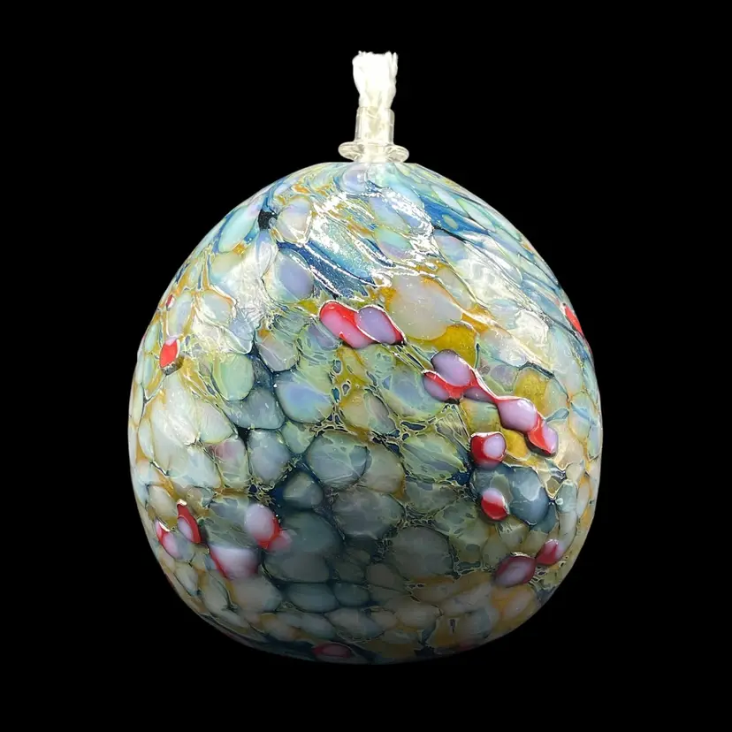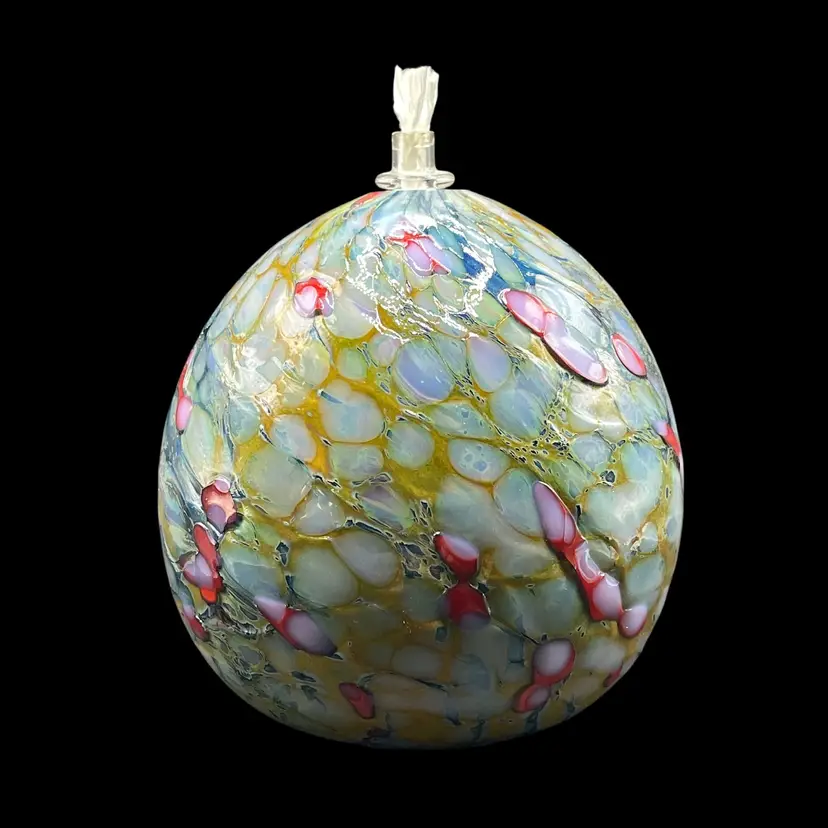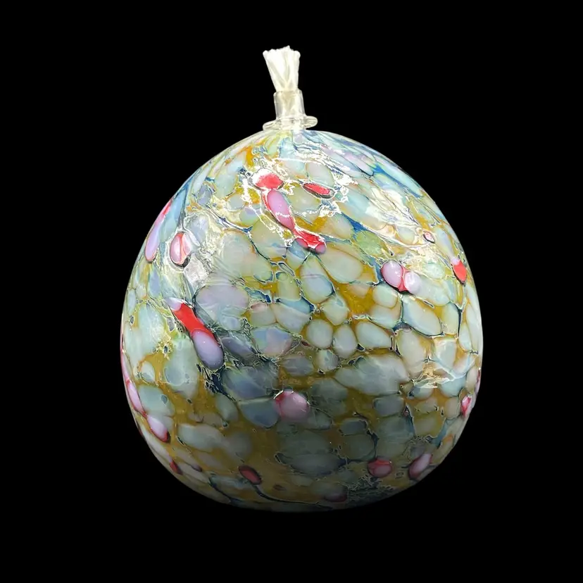 This product is a unique and handmade 1999 One Eared Cow Glass hand-blown oil lamp signed by Tom Lockart. OECG is located in Columbia, South Carolina. The lamp features a multicolor design with a white cord, making it a stylish and eclectic addition to any collection. Hand crafted from glass, this vintage oil lamp adds a touch of charm and nostalgia to any space, especially for collectors of artisanal pieces from the 1990s.