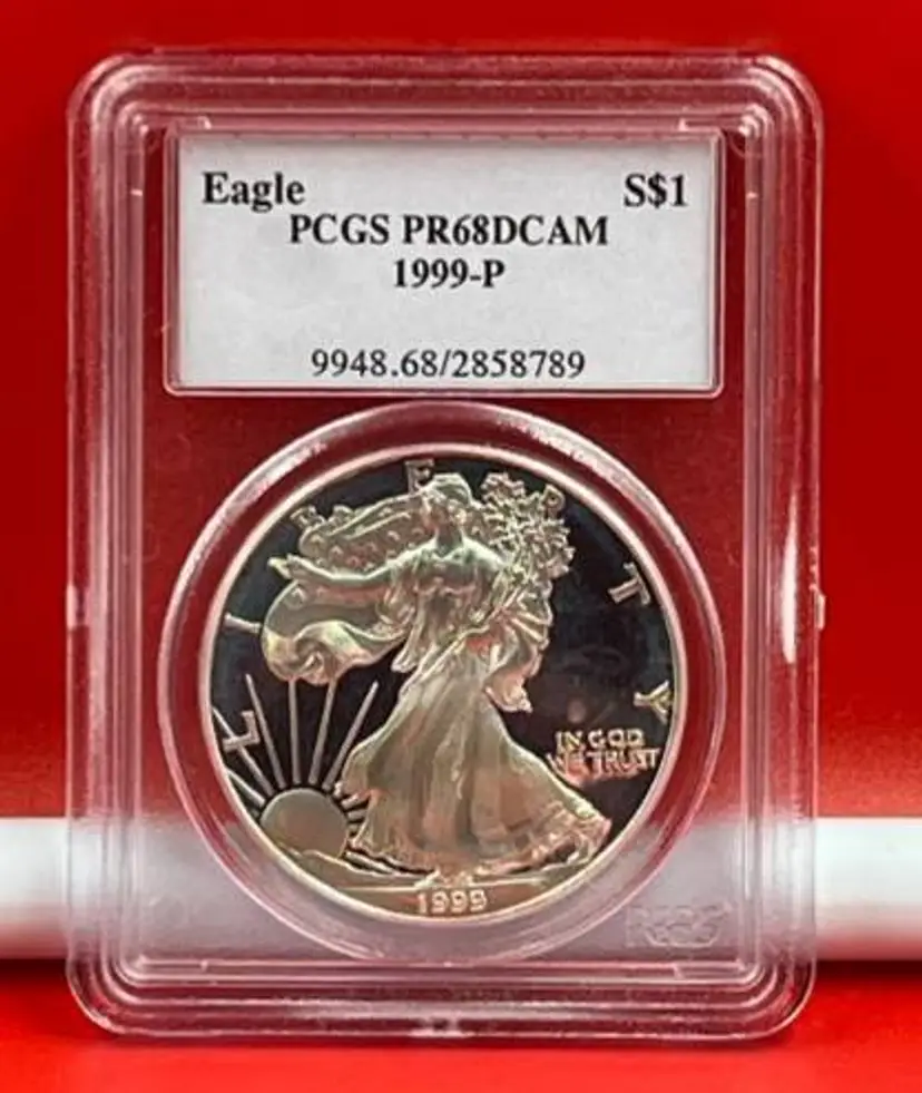 Hello, what we have is a Collector Bullion Coin from the United States Mint. Year: 1999-P. Coin: 1oz Silver American Bullion Eagle. Graded: Yes-PCGS-PR68DCAM.