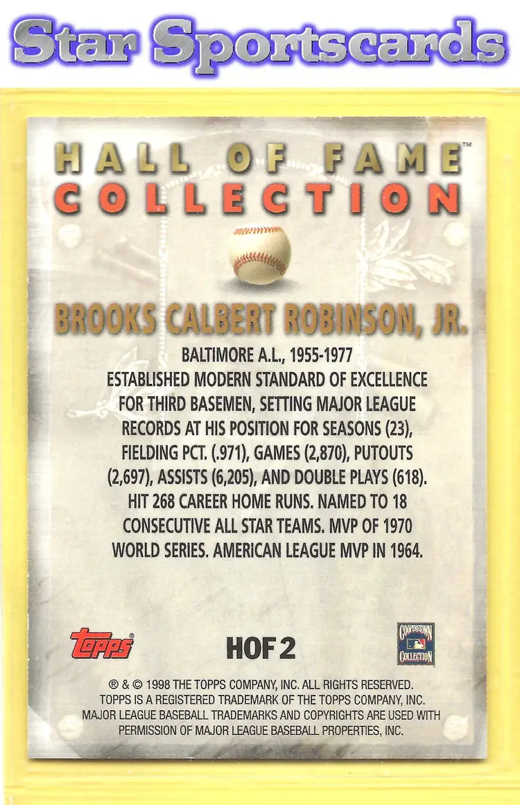 This is a nice example of a 1999 Topps #HOF2 Brooks Robinson Hall of Fame Collection .Other important information about this card: In Brooks Robinson played for the Baltimore Orioles.Please check out our other listings for more great cards.