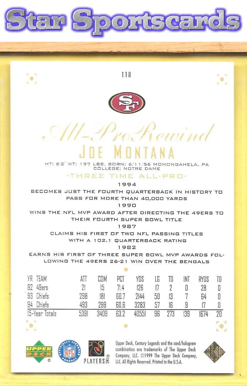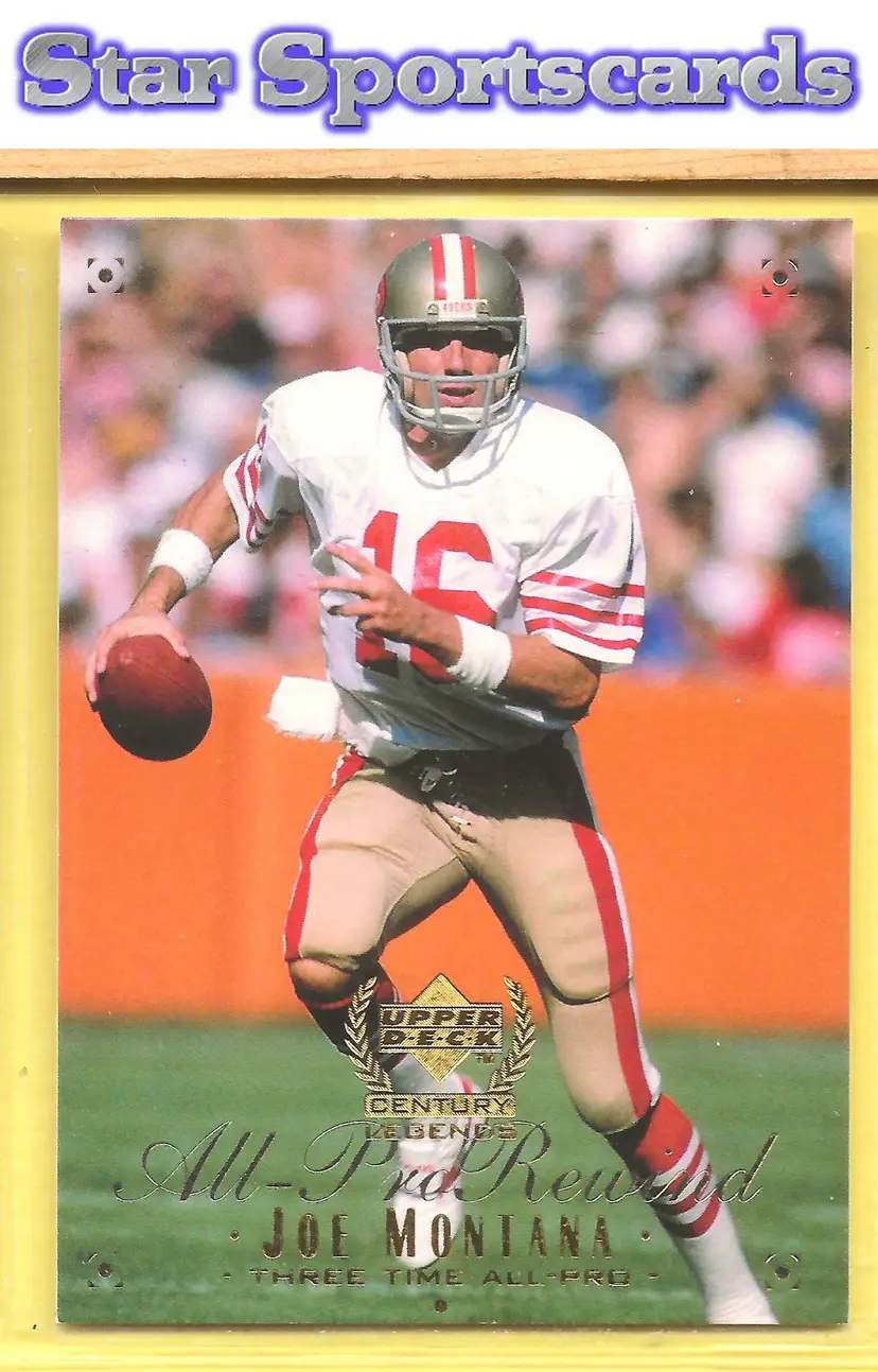 This is a nice example of a 1999 Upper Deck Century Legends #118 Joe Montana .Other important information about this card: In Joe Montana played for the San Francisco 49ers.Please check out our other listings for more great cards.