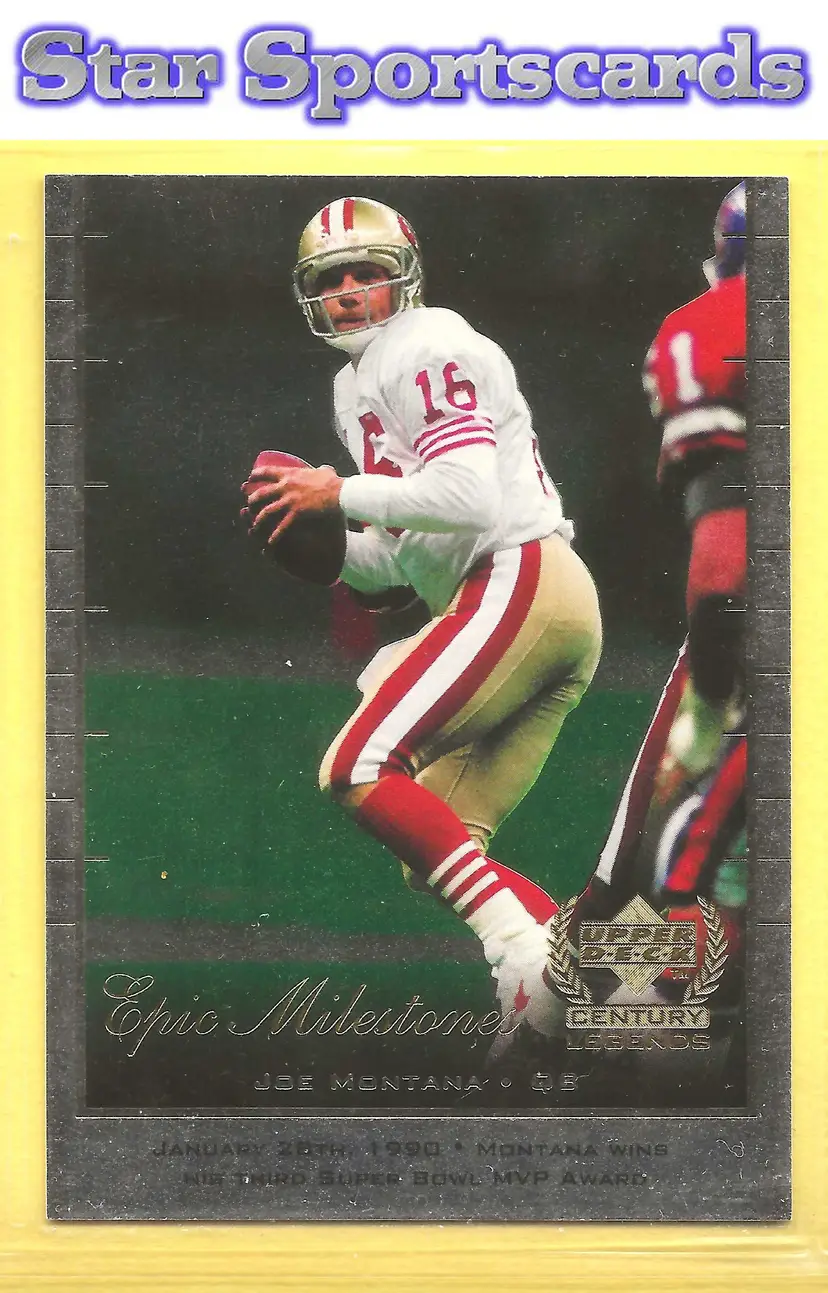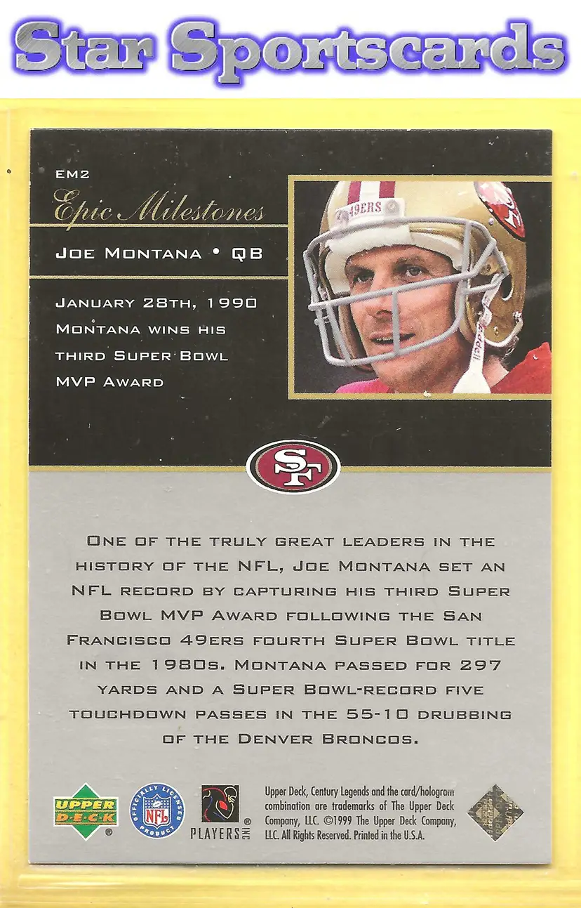 This is a nice example of a 1999 Upper Deck Century Legends #EM2 Joe Montana Epic Milestones .Other important information about this card: In Joe Montana played for the San Francisco 49ers.Please check out our other listings for more great cards.