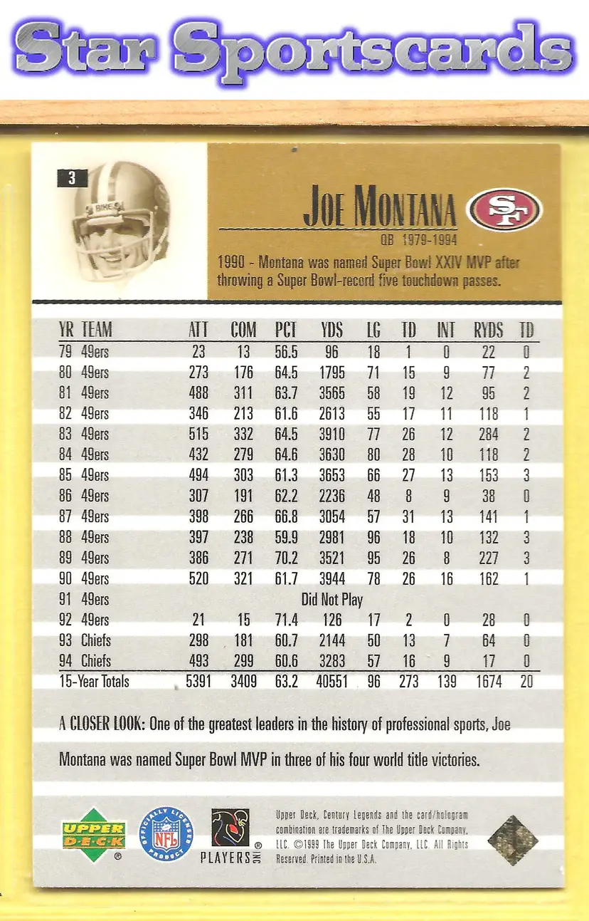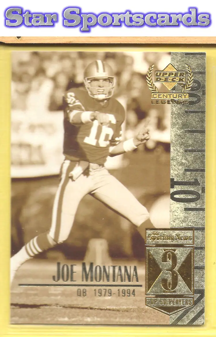 This is a nice example of a 1999 Upper Deck Century Legends #3 Joe Montana .Other important information about this card: In Joe Montana played for the San Francisco 49ers.Please check out our other listings for more great cards.