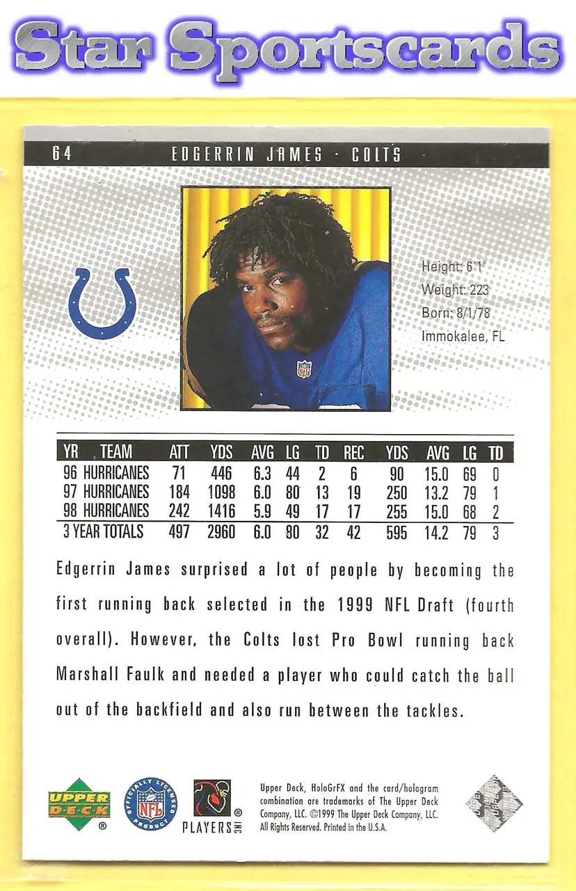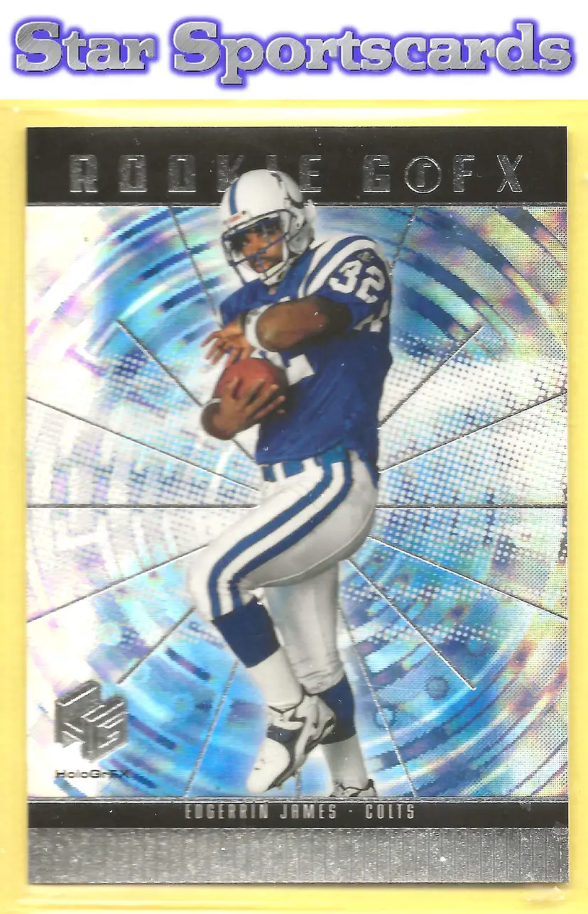 This is a nice example of a 1999 Upper Deck HoloGrFX #64 Edgerrin James .Other important information about this card: RC Rookie In Edgerrin James played for the Indianapolis Colts.Please check out our other listings for more great cards.