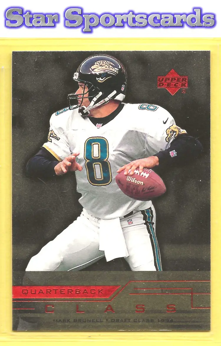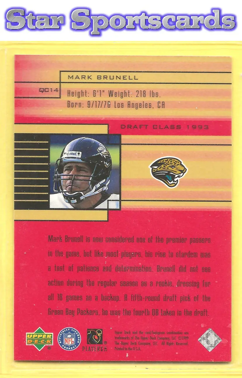 This is a nice example of a 1999 Upper Deck #QC14 Mark Brunell Quarterback Class .Other important information about this card: In Mark Brunell played for the Jacksonville Jaguars.Please check out our other listings for more great cards.