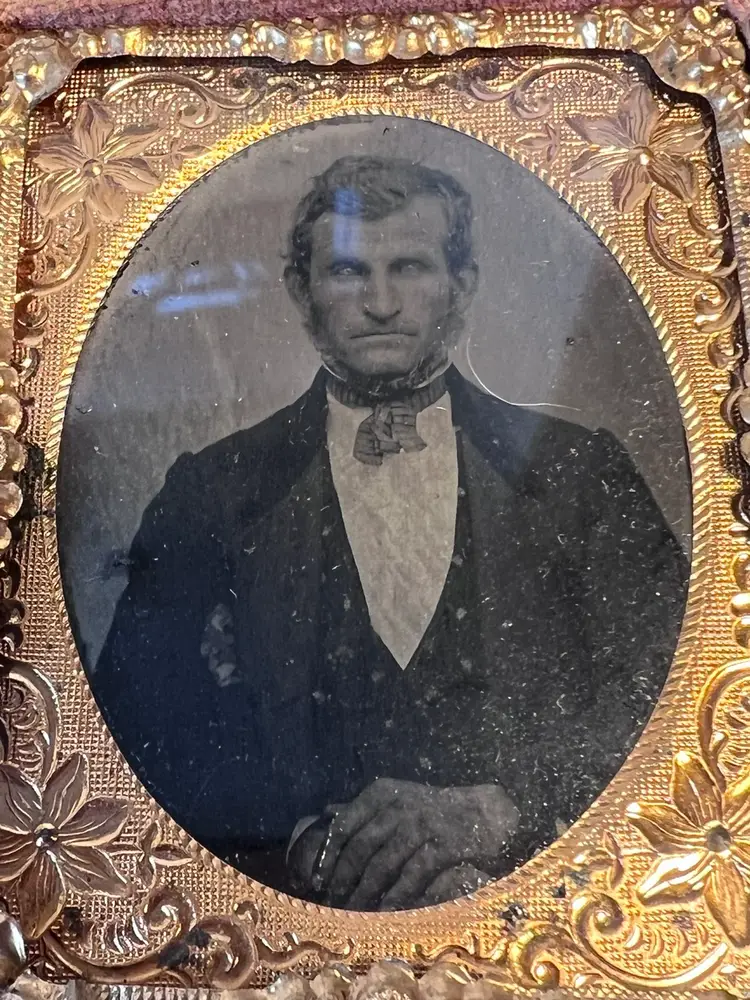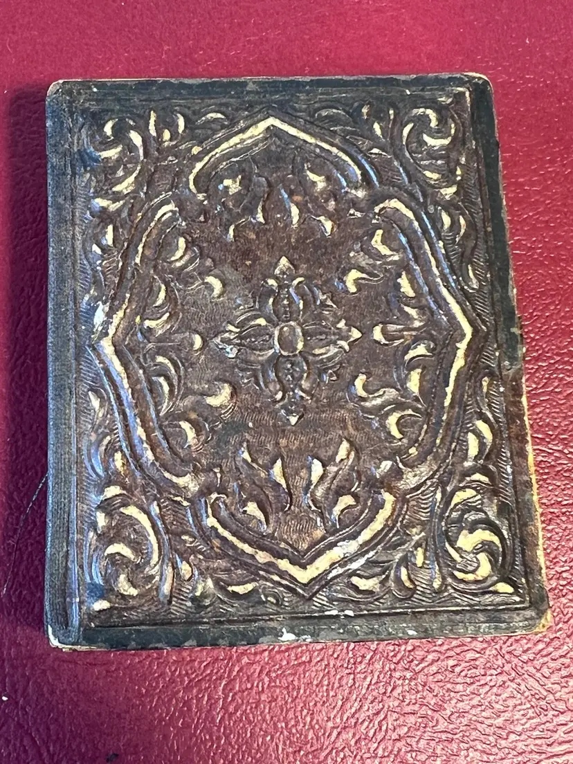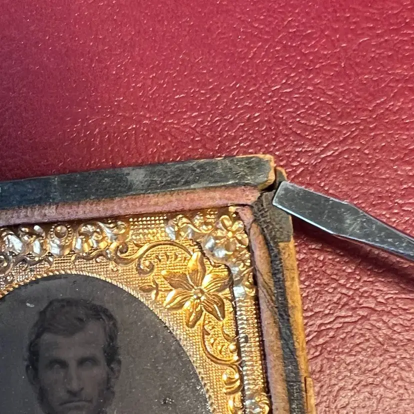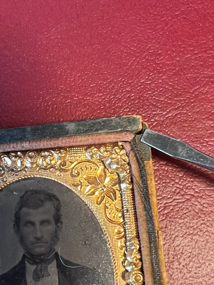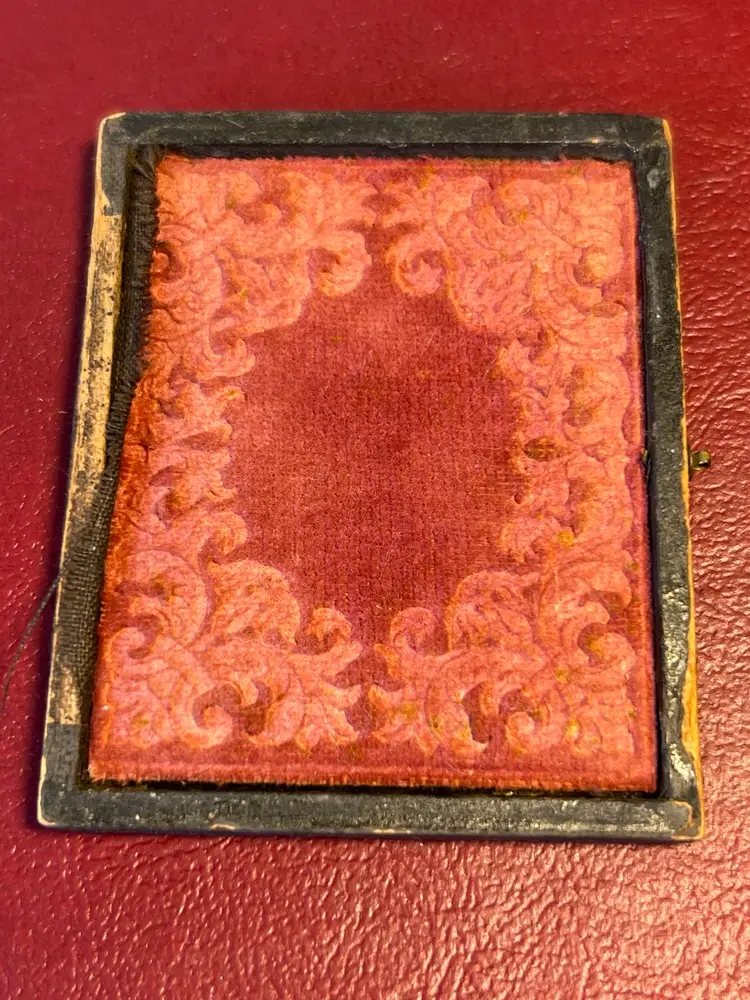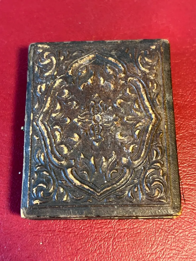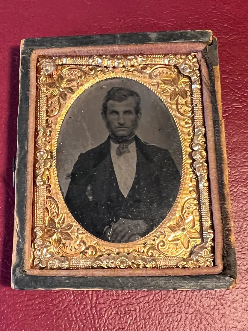 2” x 2.5” ninth plate tintype photo of a man in dress clothes. Slight hand tinted pink cheeks. Wooden cloth covered case with velvet inset. Golden oval metal Matt. Cloth hinge is no longer intact. Slight split on top right corner. Original hand written name found under picture. Please review the pictures for condition and let me know if you have any questions before purchasing