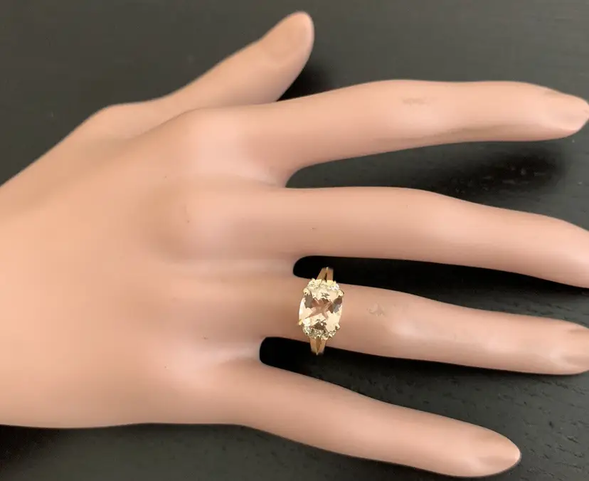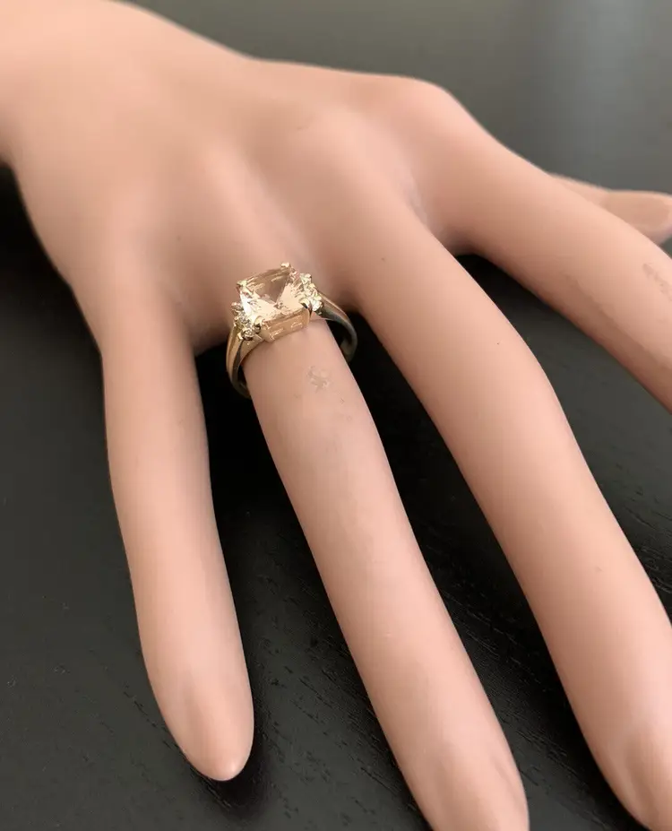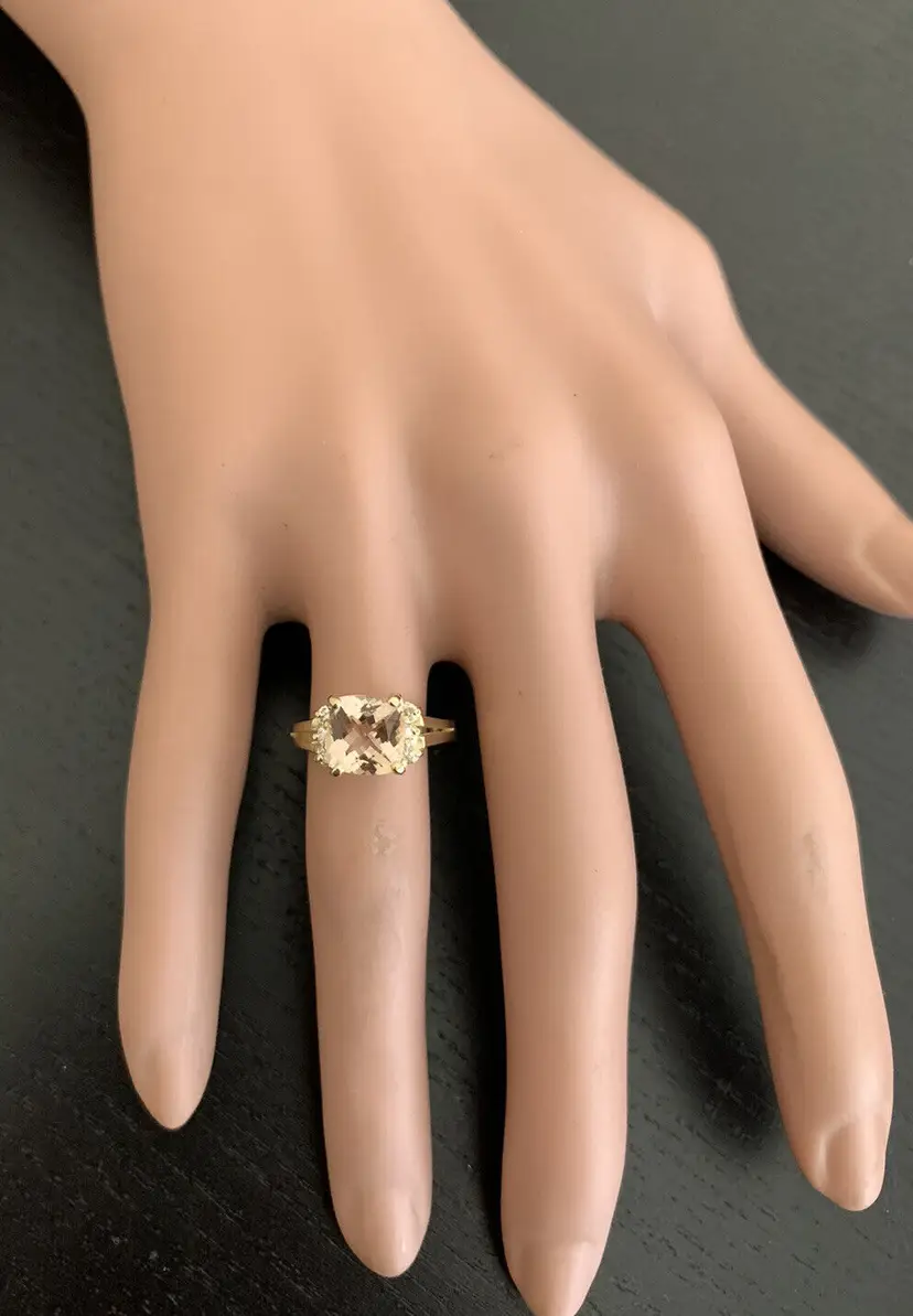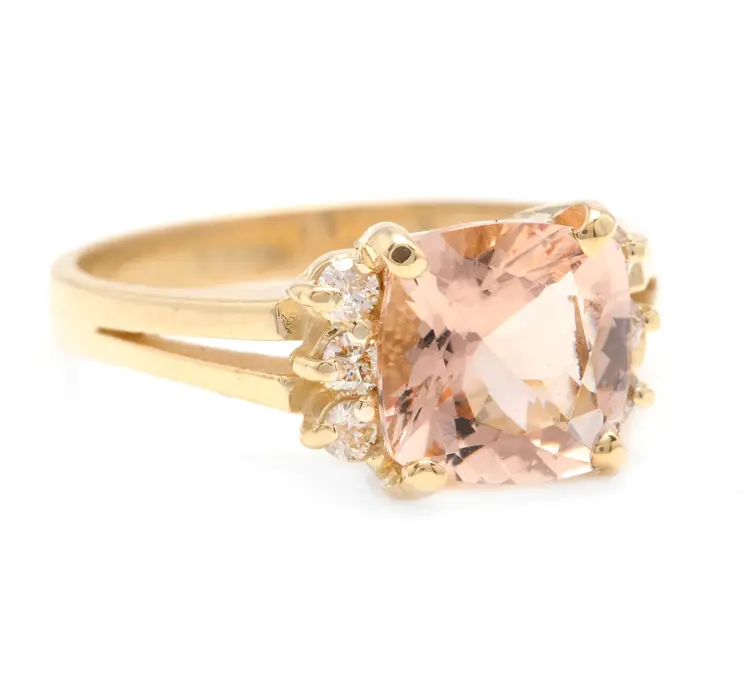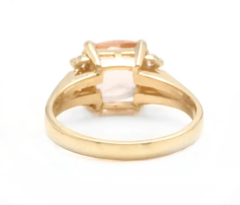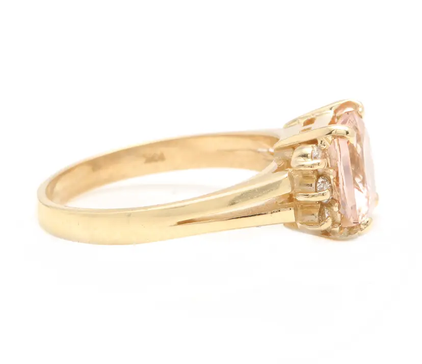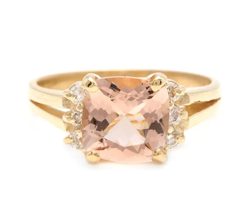 Main Stone: Morganite Total Carat Weight (TCW): 2.12 Metal: Yellow Gold Main Stone Treatment: Heating Sizable: Yes Secondary Stone: Morganite Style: With Diamonds & Gemstones Metal Purity: 14k Main Stone Shape: Cushion Square Ring Size: 6 Main Stone Creation: Natural Main Stone Color: Peach Brand: Unbranded Type: Ring