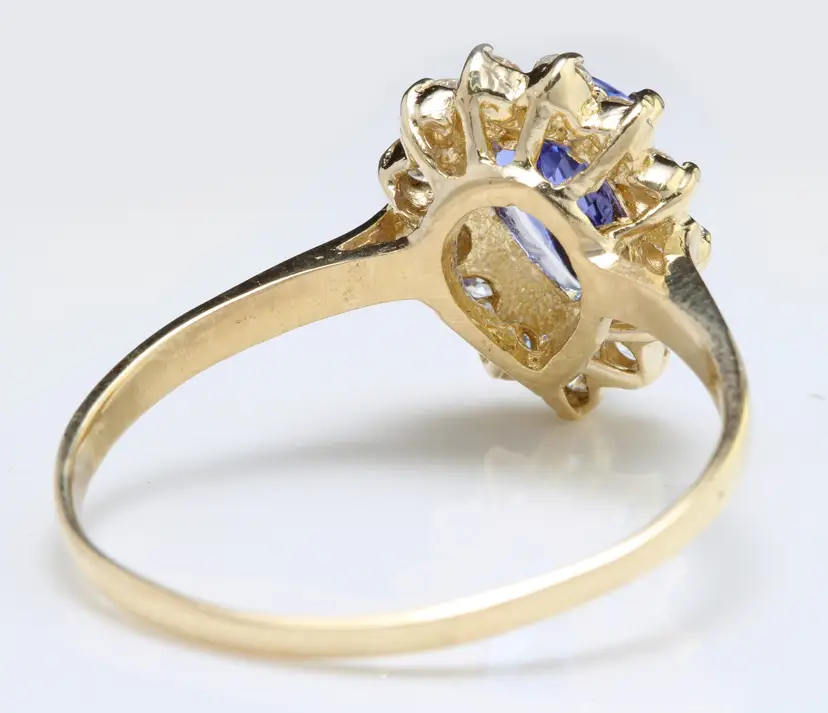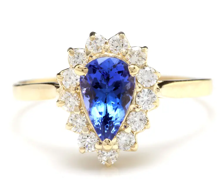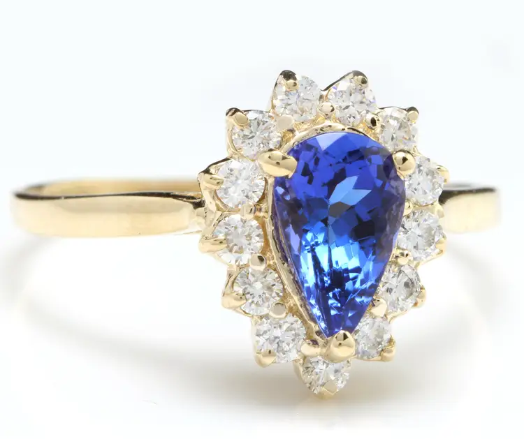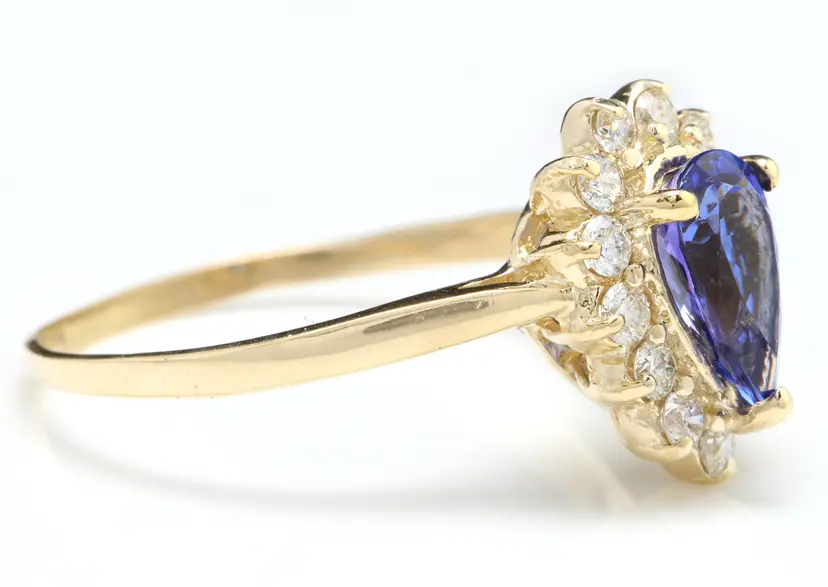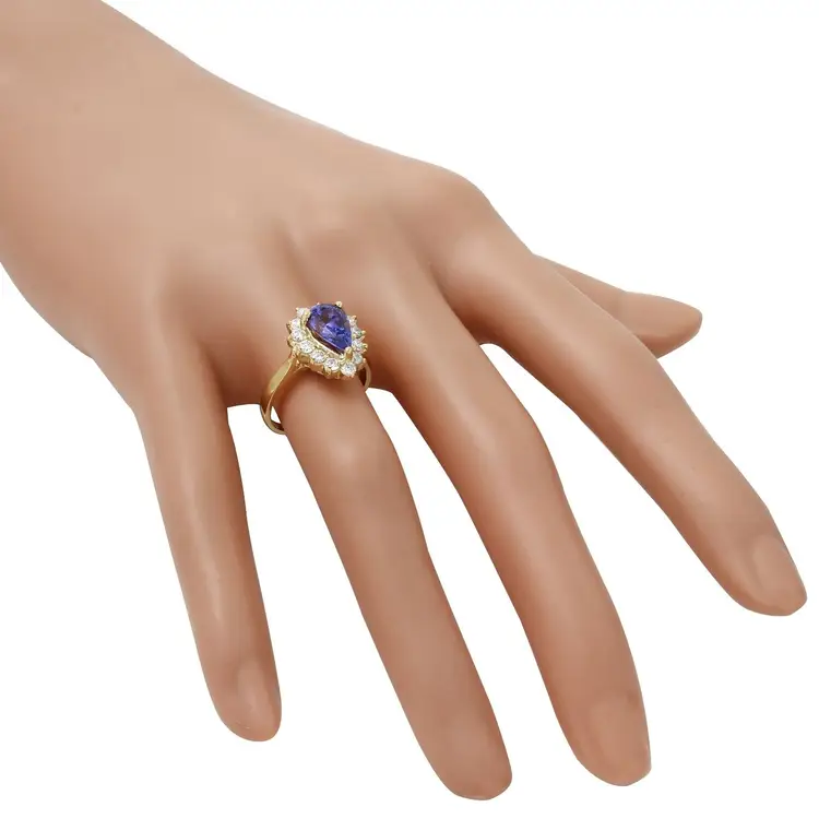 Metal: Yellow Gold Metal Purity: 14k solid gold Sizable: Yes Main Stone: Tanzanite Main Stone Color: Bluish Violet Total Carat Weight (TCW): 2.55 Main Stone Shape: Pear Ring Size: 7 Main Stone Creation: Treated Main Stone Treatment: Heating Brand: Unbranded Type: Ring