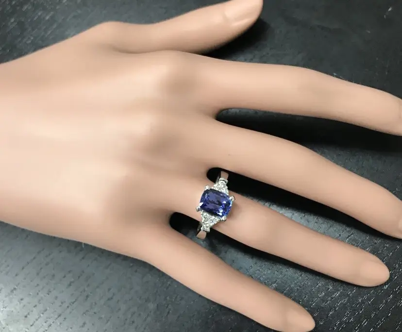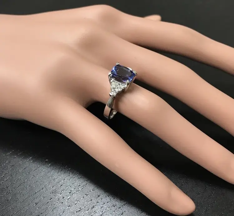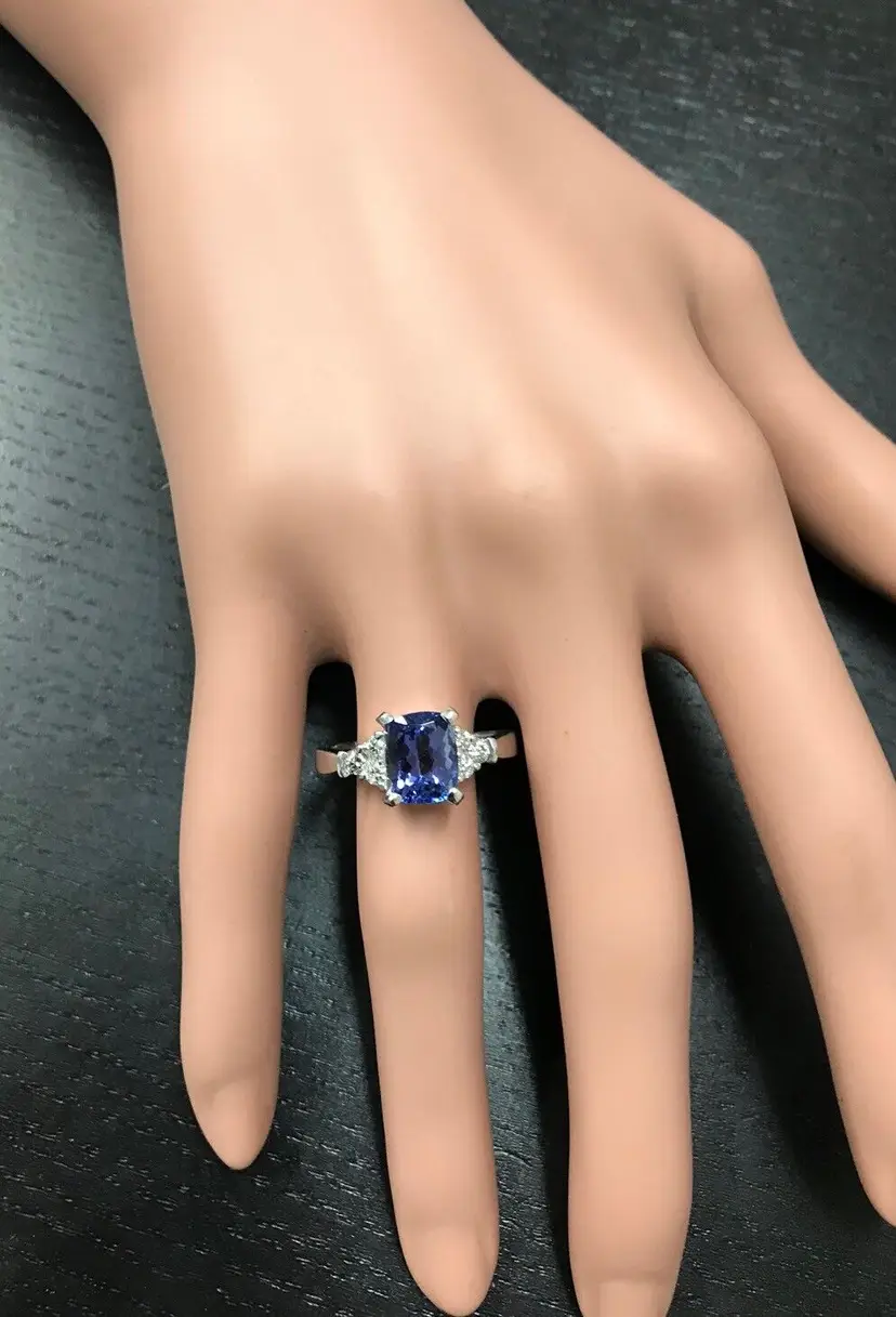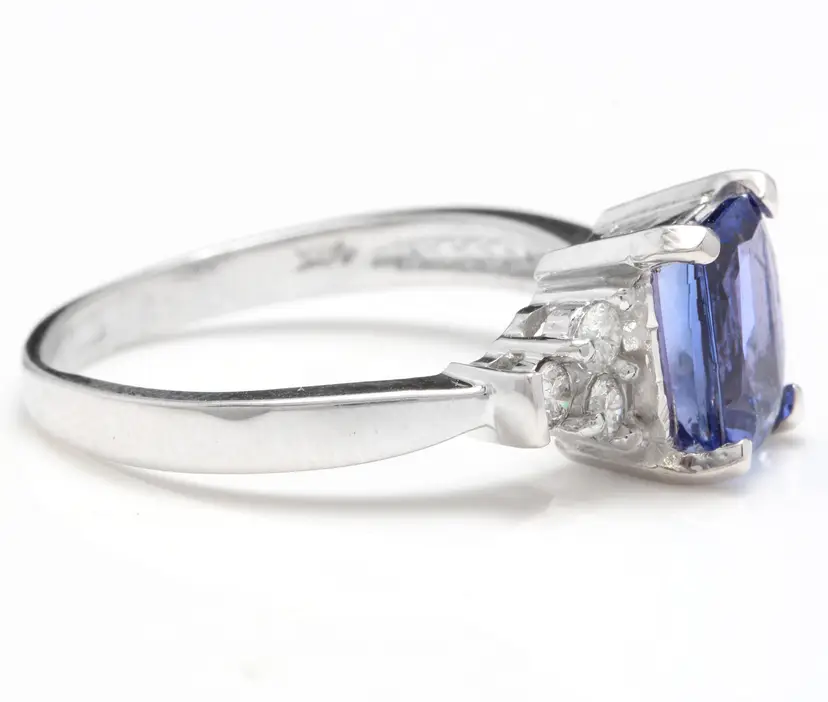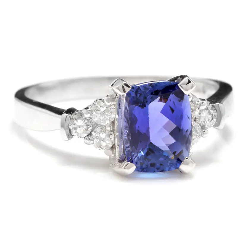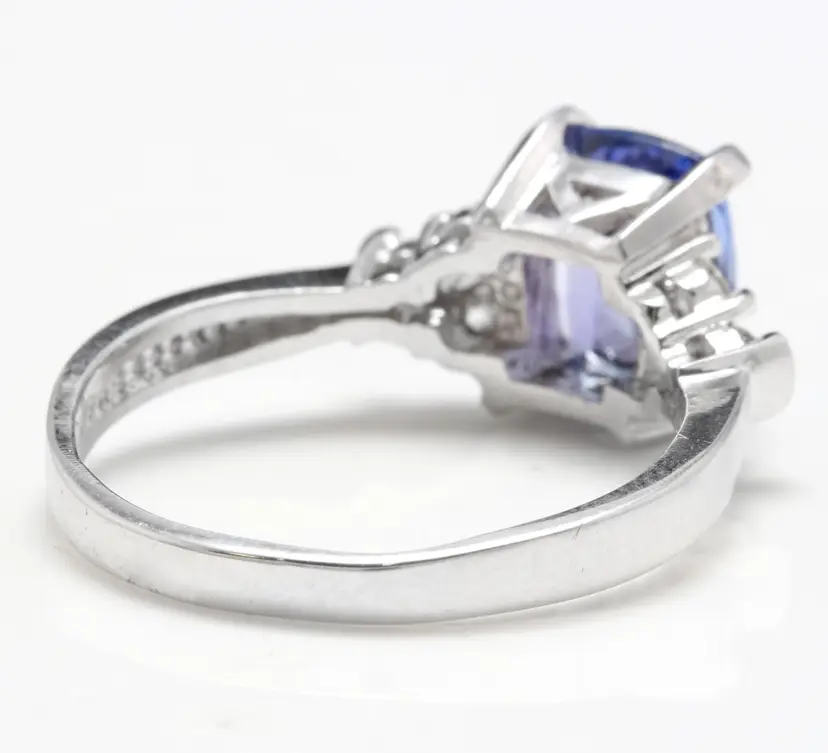 Metal: White Gold Sizable: Yes Main Stone: Tanzanite Total Carat Weight (TCW): 2.90 Main Stone Shape: Cushion Main Stone Color: Bluish Violet Ring Size: 6 Main Stone Creation: Treated Main Stone Treatment: Heating Metal Purity: 14k Total Carat Weight: 2.90 Brand: Unbranded Type: Ring