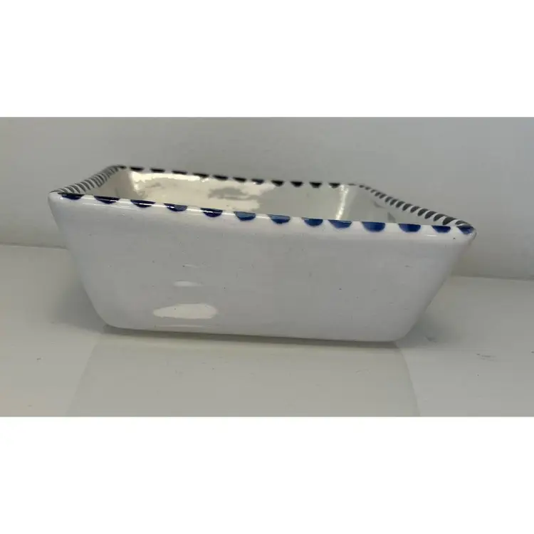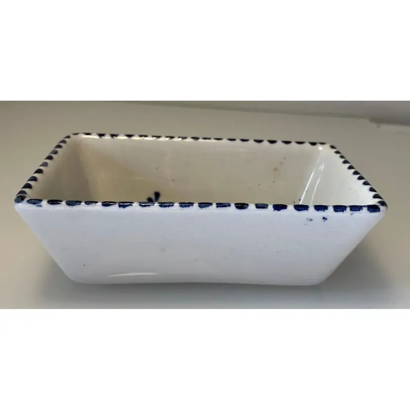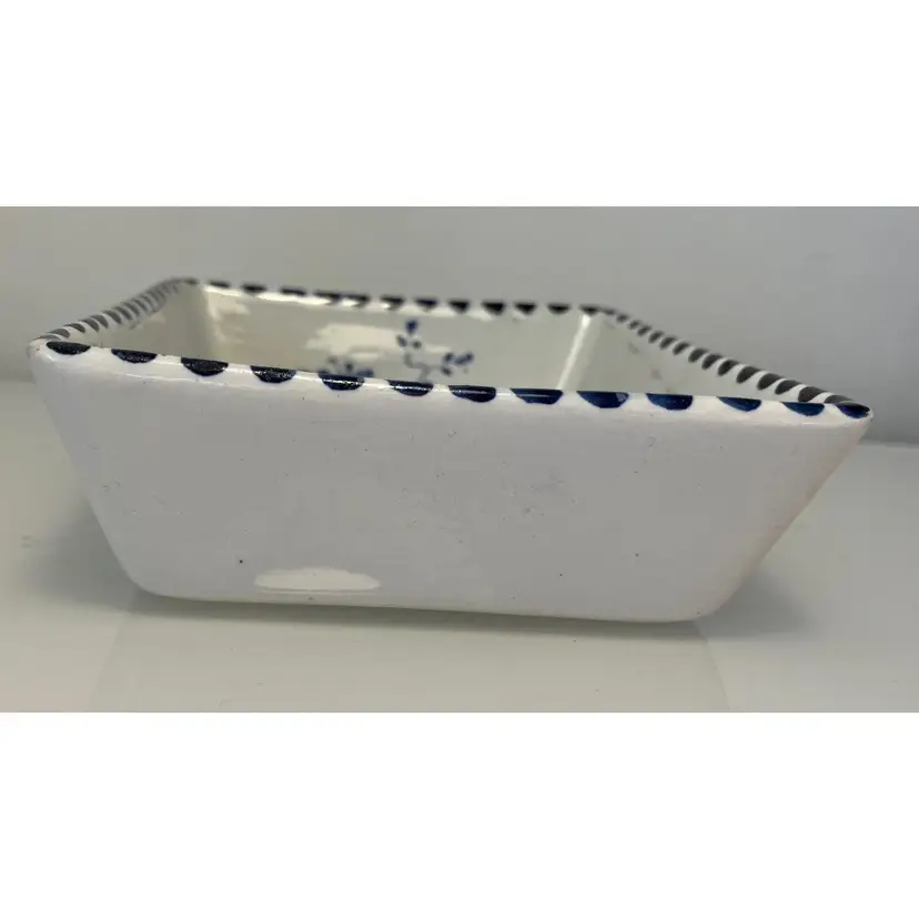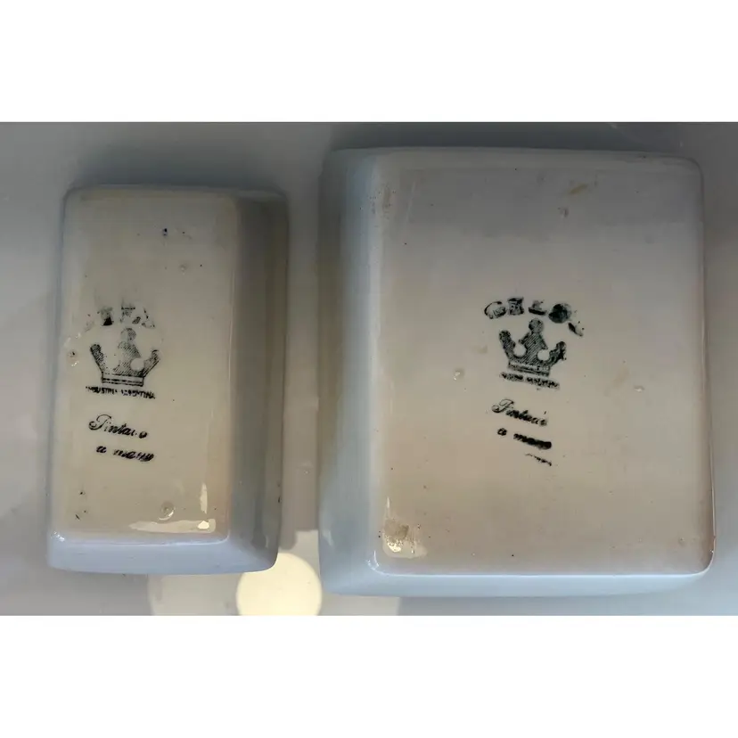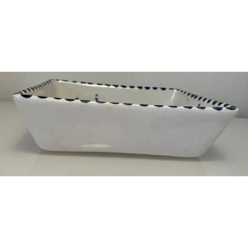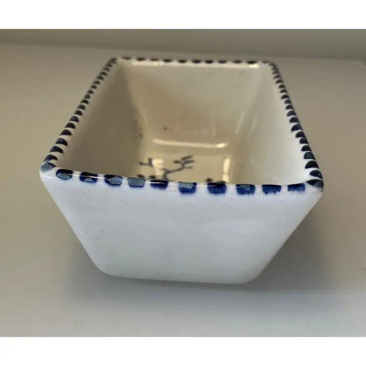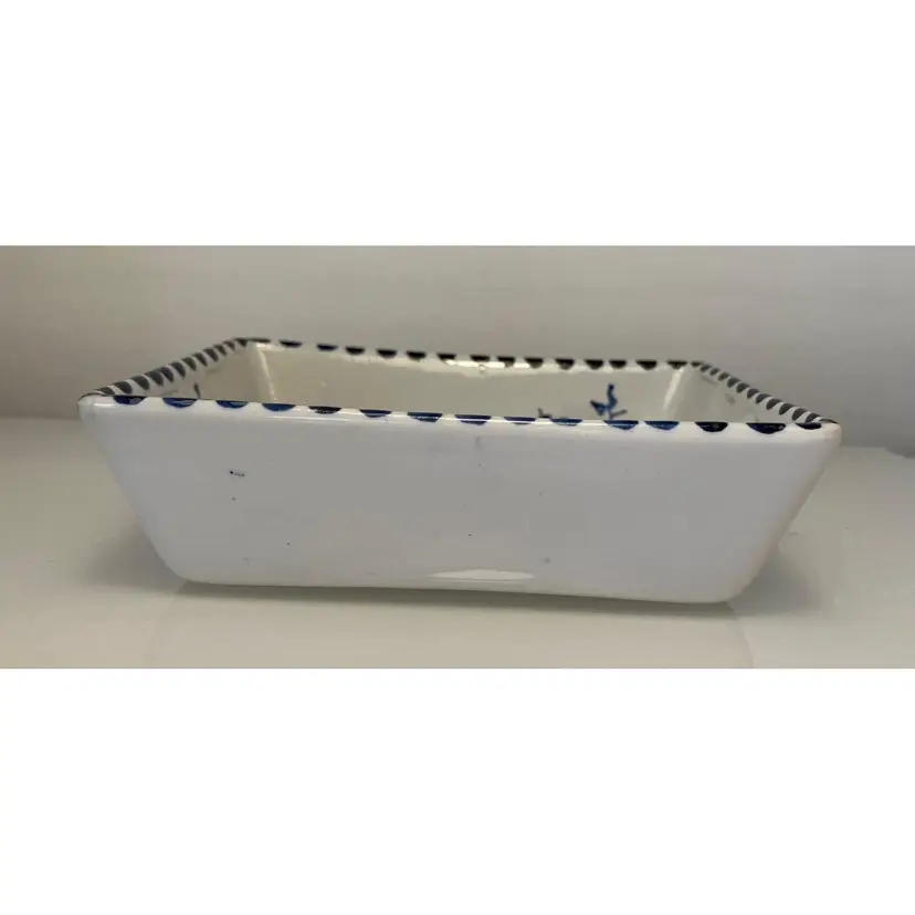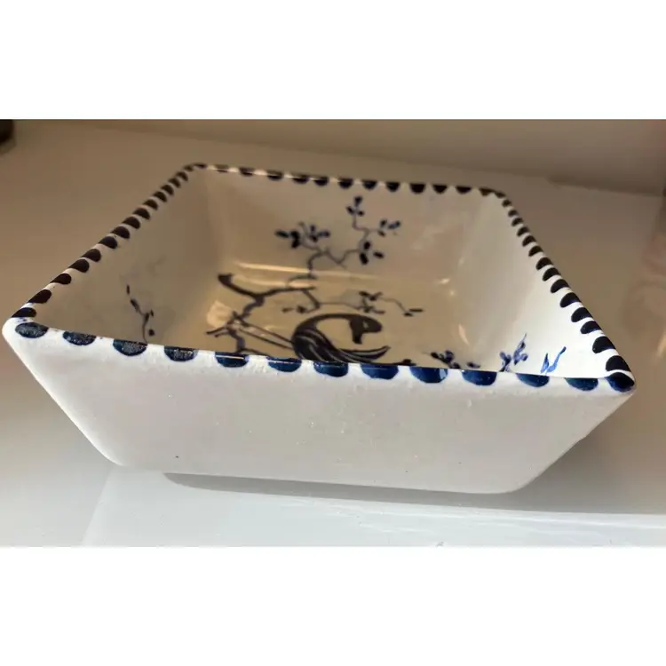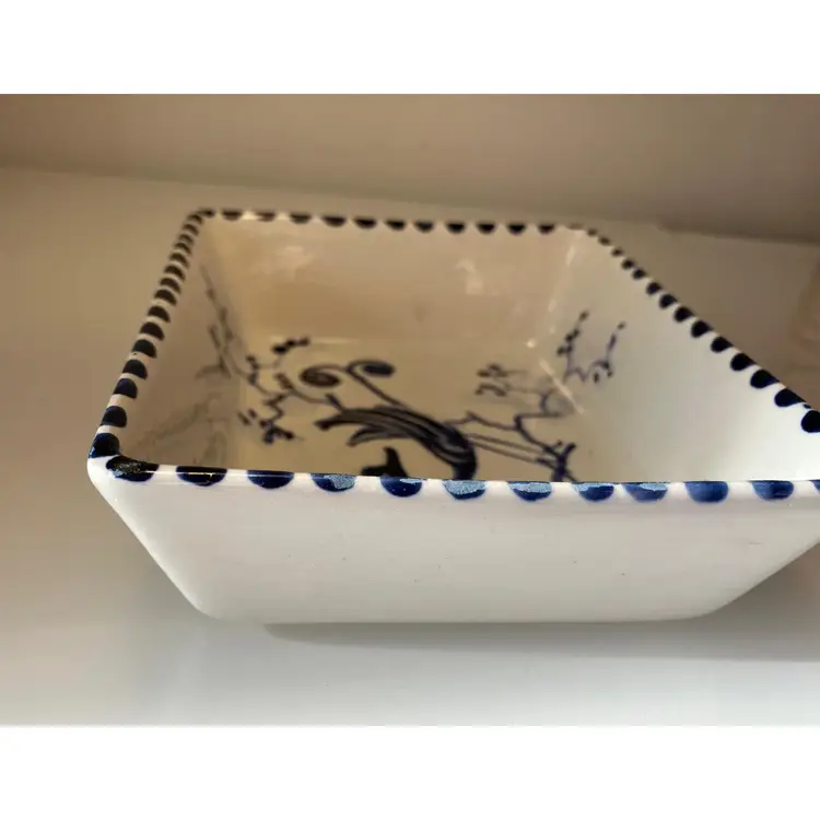 2 Porcelain serving dishes probably previously used for serving appetizers. After doing a little research I believe these are originally from Argentina. They are handpainted with branches and a bird. There are condition issues: all of the rims of the smaller dish are rough from where the glaze has been pulled up or chipped. This problem has also affected 2 of the sides of the larger dish. So now they would likely be used for decoration only. There are no other chips and there are no cracks.The larger dish measures 5" by 4 1/4" 1 3/8" and the smaller dish 4 1/2" by 2 1/2" by 1 3/8".
