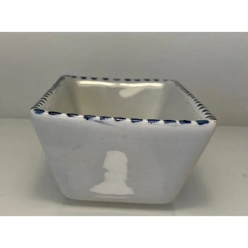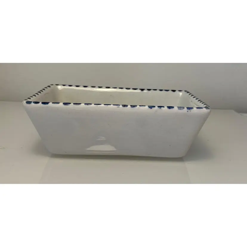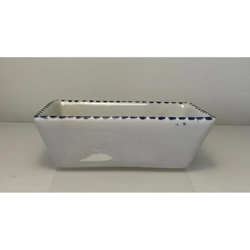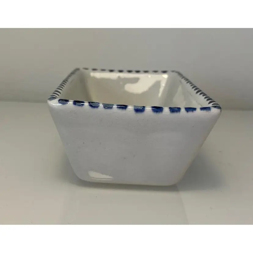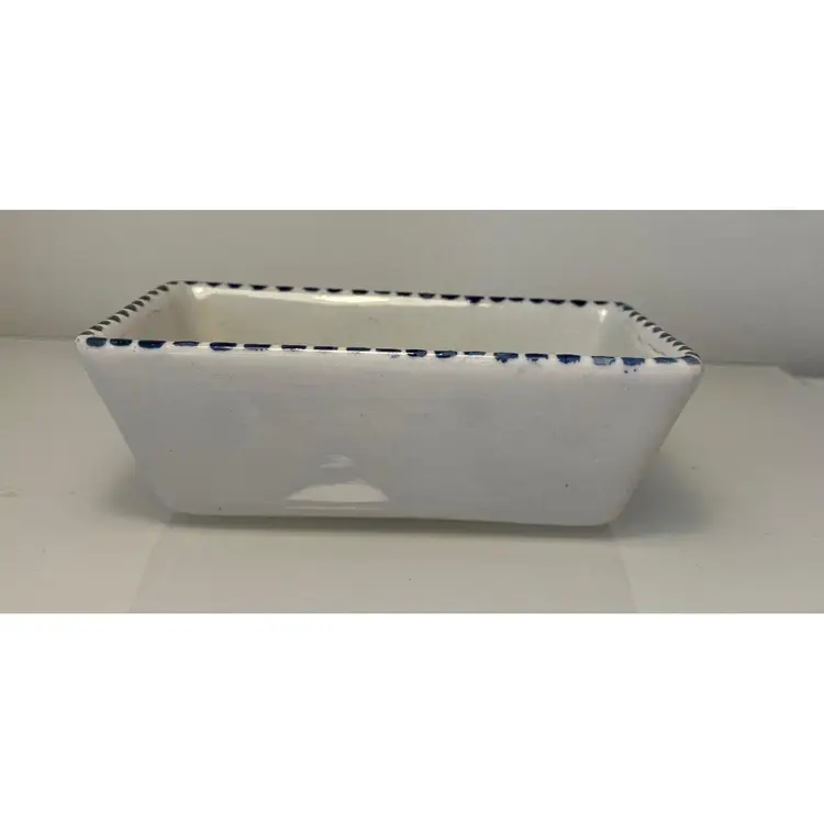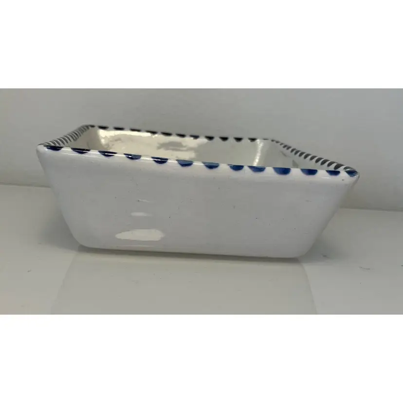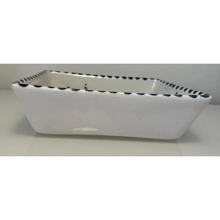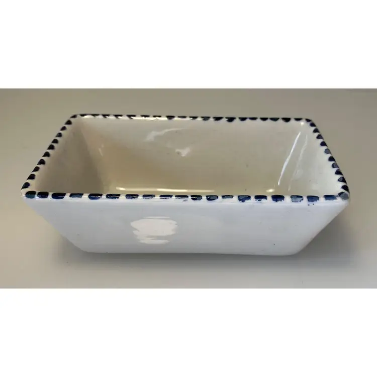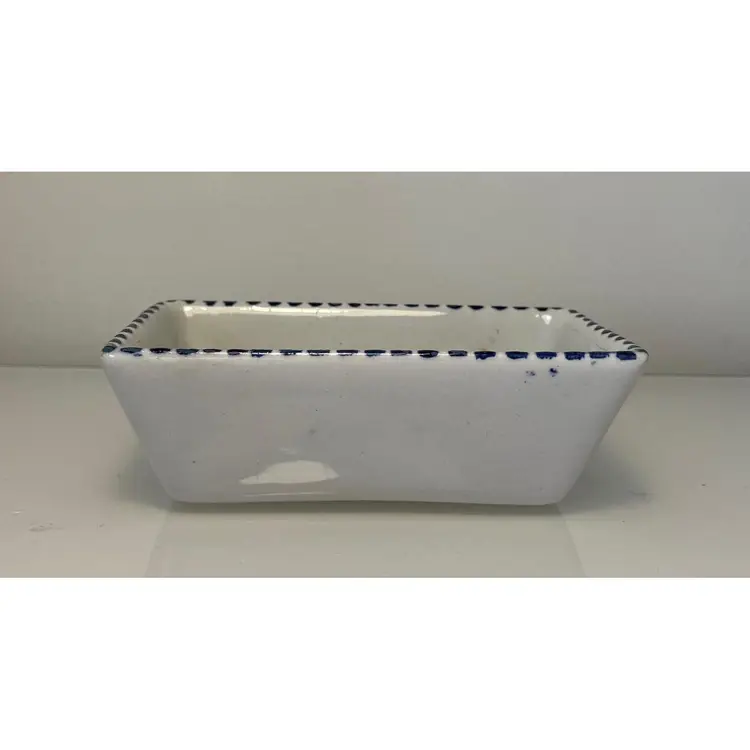 2 Porcelain serving dishes probably previously used for serving appetizers. After doing a little research I believe these are originally from Argentina. They are handpainted with branches and a bird. There are condition issues: all of the rims of the smaller dish are rough from where the glaze has been pulled up or chipped. This problem has also affected 2 of the sides of the larger dish. So now they would likely be used for decoration only. There are no other chips and there are no cracks.The larger dish measures 5" by 4 1/4" 1 3/8" and the smaller dish 4 1/2" by 2 1/2" by 1 3/8".