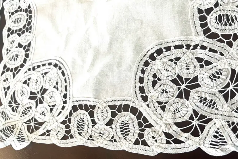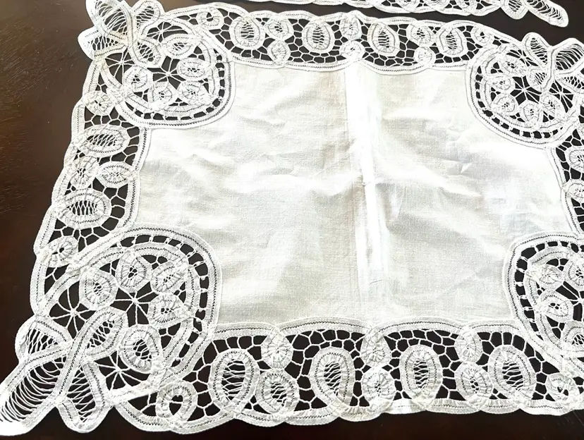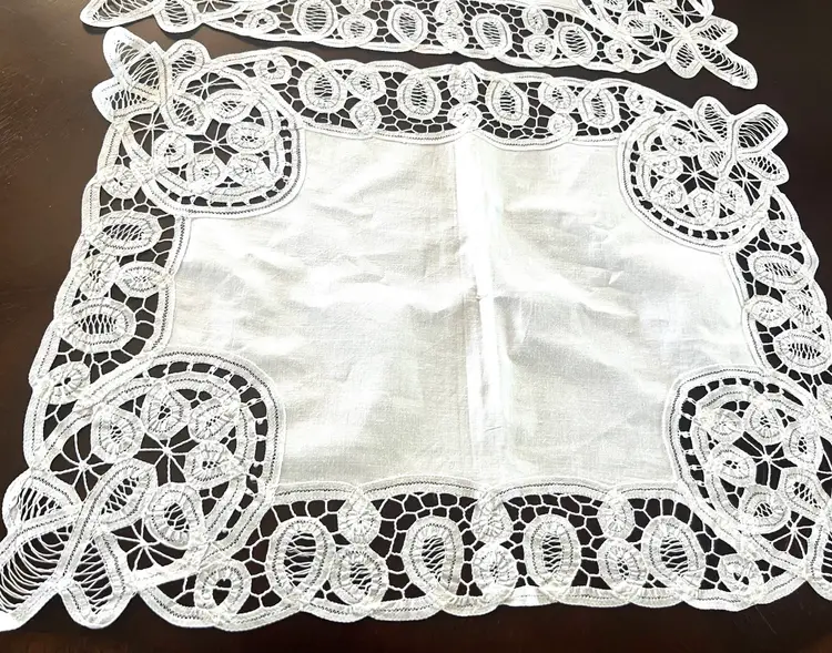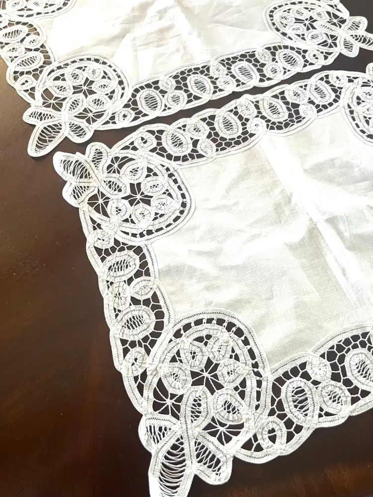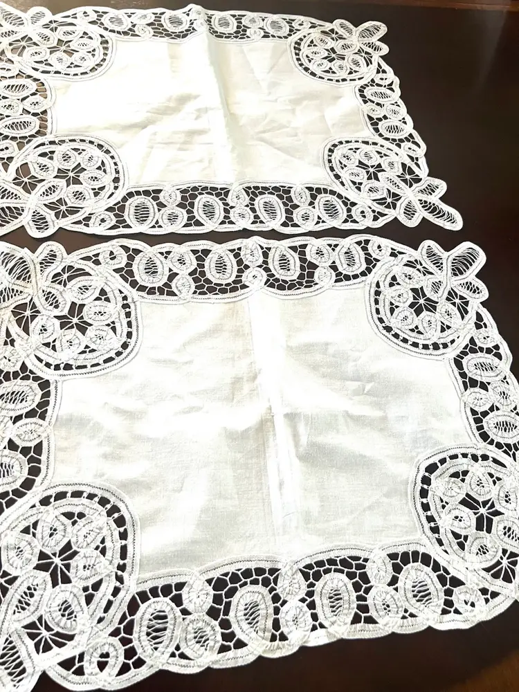 Fabulous 2 battenberg lace white on white cutwork placemats are in great condition. Purchased recently at an estate sale and surprised to find mats in perfect condition. Great gift for the bride or for someone who loves to decorate in the vintage style. Looks great on the table. This was a real find. Size: each 16 by 20 inches Condition: vintage excellent. - may have been washed once.