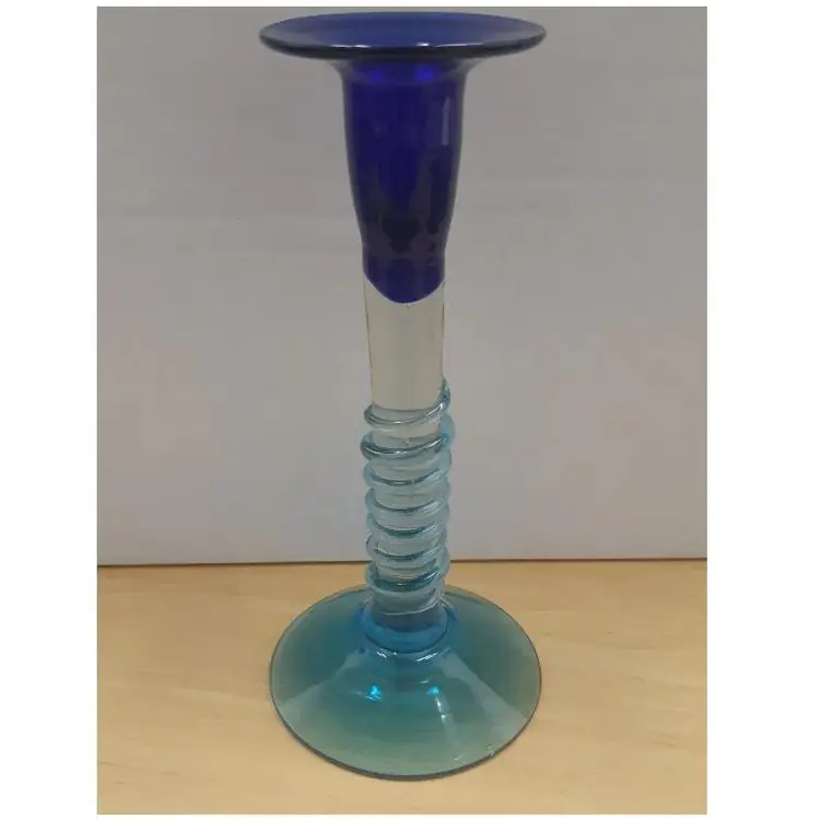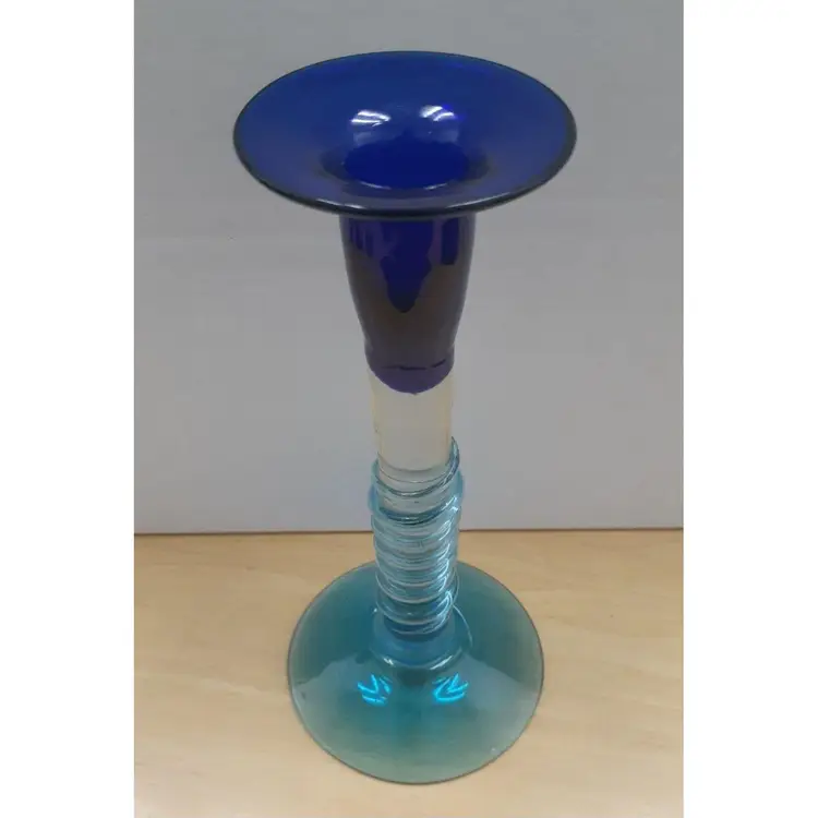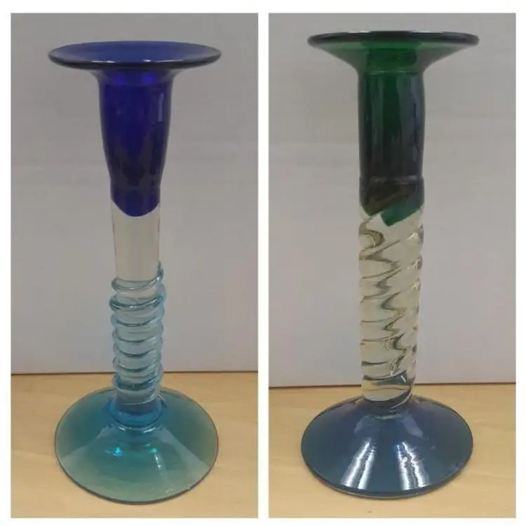 The first candle holder pictured is a vintage hand blown art glass candle holder with both green and blue glass. It is about 9 inches tall. No chips or cracks.
