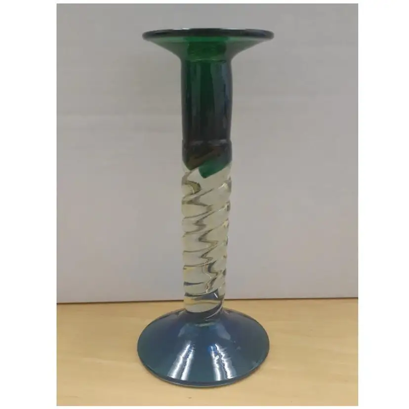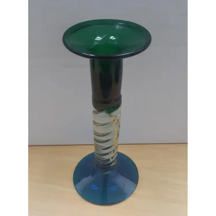 The second xandle holder pictured is also made with green and blue glass. It is about 8 inches tall with a swirled stem. Hand blown. no chips or cracks.