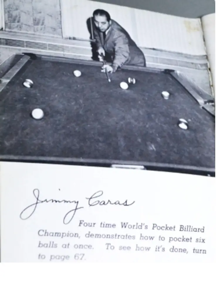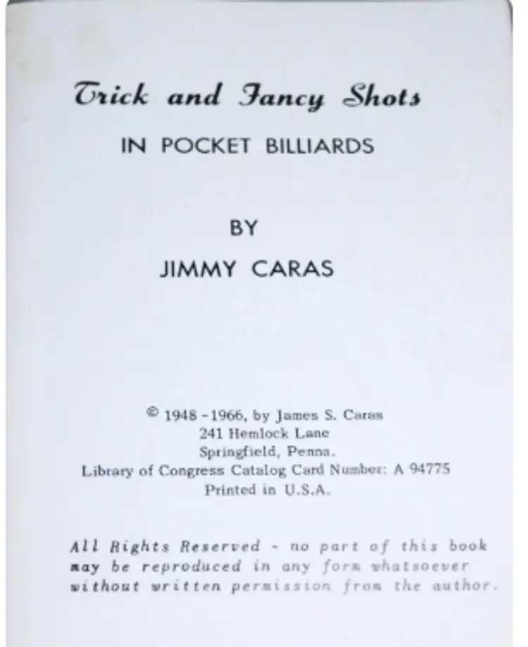 Trick And Fancy Shots In Pocket Billiards by Jimmy Carras is from 1966. He was a four time Billiard Champion. This book goes into details on the shots and has diagrams of each. There is some pen marks on inside back cover on this one.