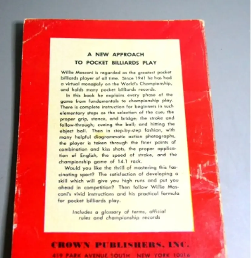 Pocket Billiards by Crown Publishers in 1959 done by Willie Mosconi. He was a world champion almost every time from 1941. This book covers topics from the basics to championship play.