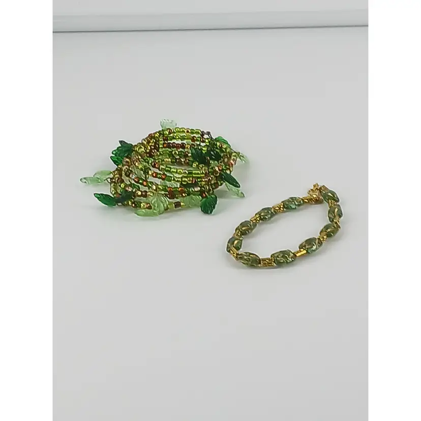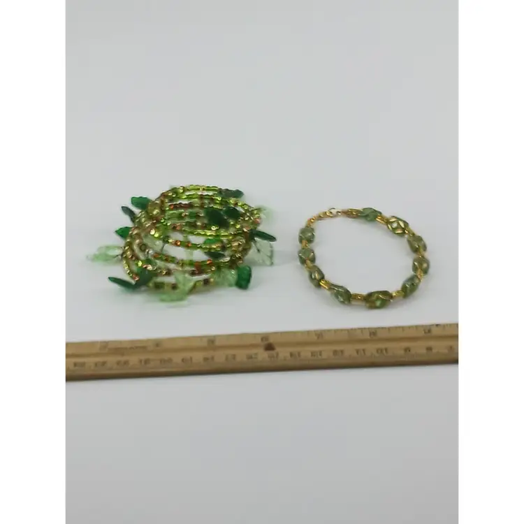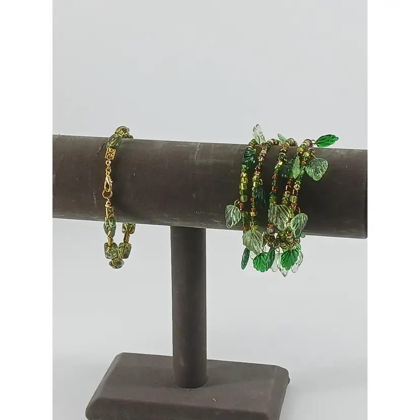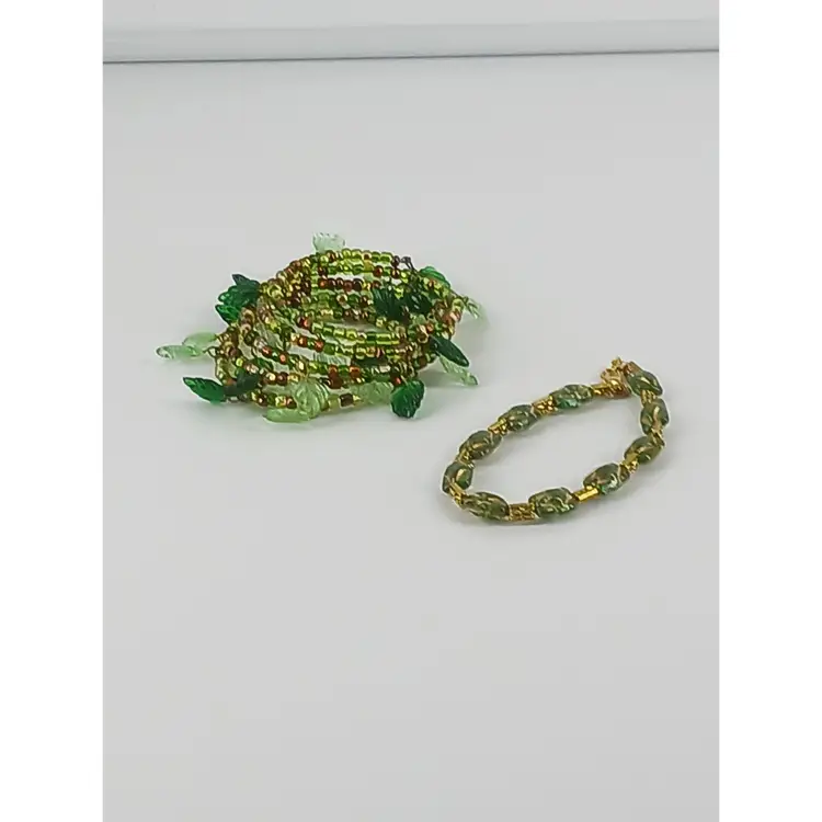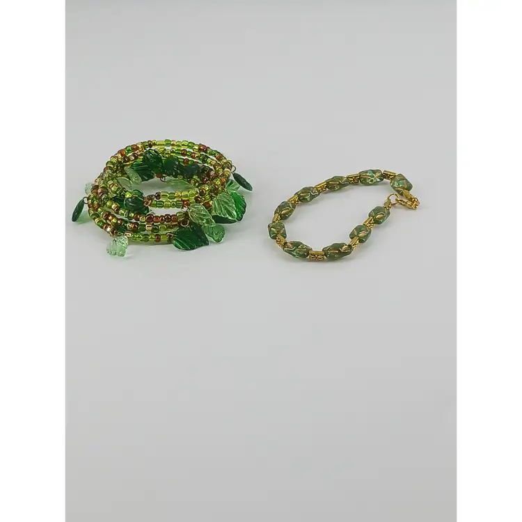 BM192 – 2 ¼ inch in diameter of silver plated memory wire in five rows of greens and topaz colored glass beads make up the body of this bracelet. Light and dark green molded leaf beads of glass dangle throughout.